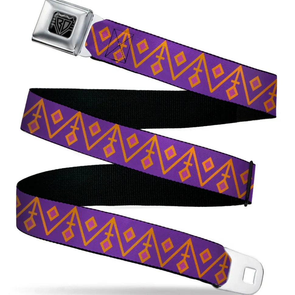 BD Wings Logo CLOSE-UP Black/Silver Seatbelt Belt – Aztec22 Purple/Orange/Pink Webbing