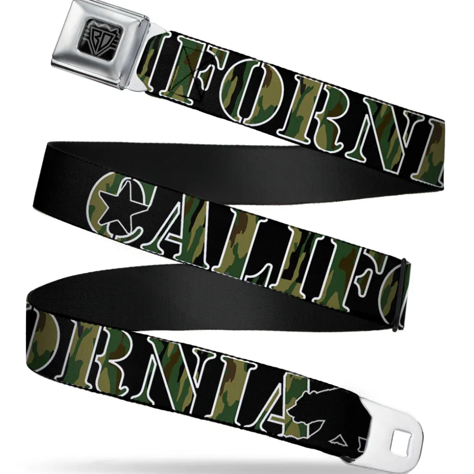 BD Wings Logo CLOSE-UP Full Color Black Silver Seatbelt Belt – CALIFORNIA/Bear Silhouette Black/Camo Olive Webbing