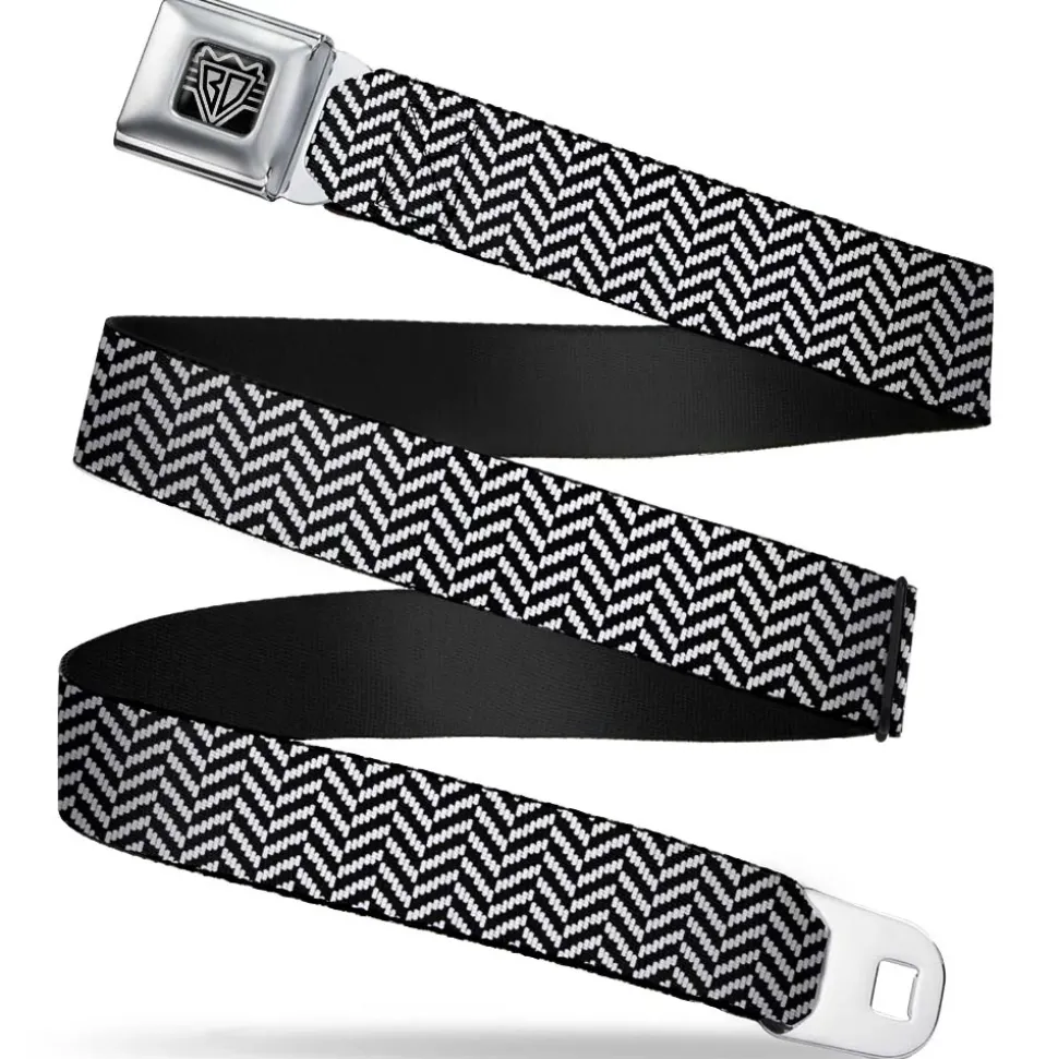 BD Wings Logo CLOSE-UP Full Color Black Silver Seatbelt Belt – Herringbone Jagged Black/White Webbing