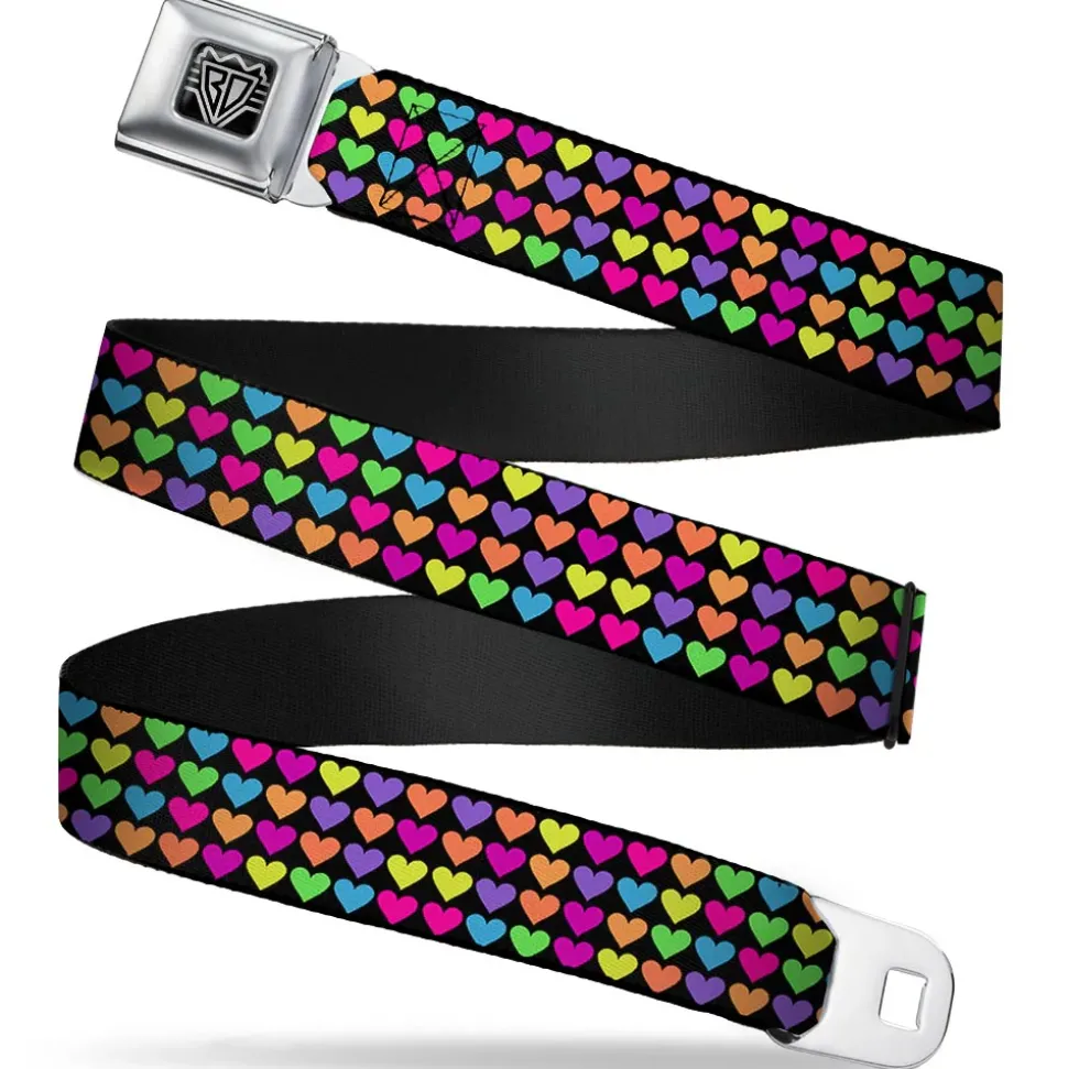 BD Wings Logo CLOSE-UP Full Color Black Silver Seatbelt Belt – Mini Hearts Black/Multi Neon Webbing