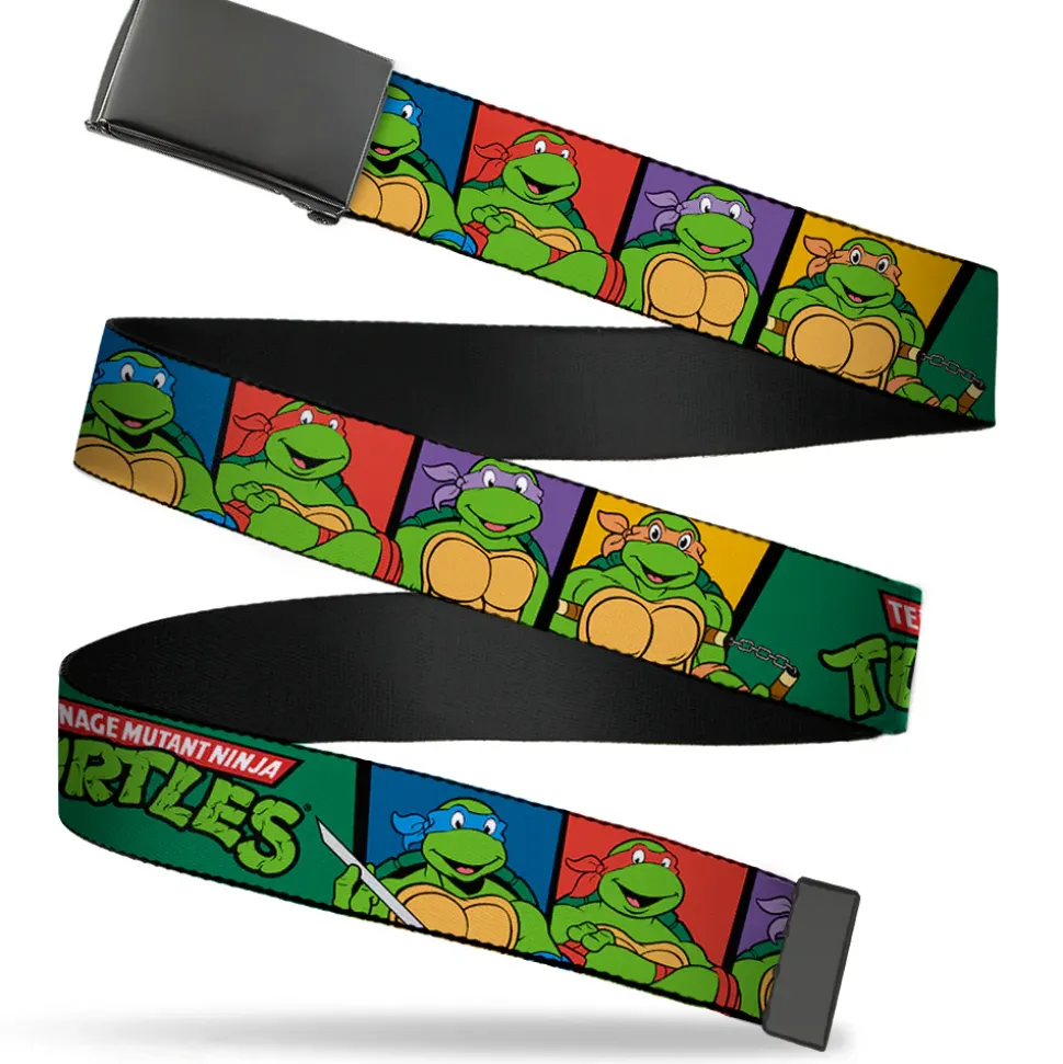 Black Buckle Web Belt – Classic TEENAGE MUTANT NINJA TURTLES Group Pose3/TMNT Logo Green/Multi Color Webbing
