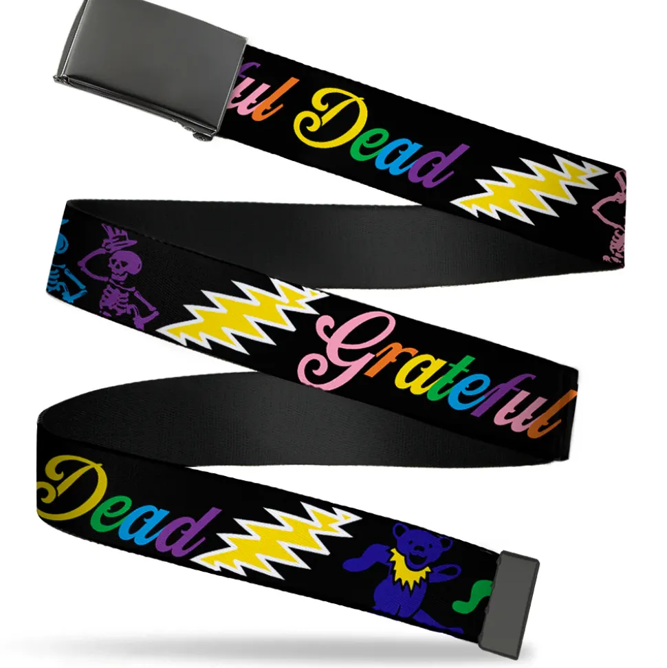 Black Buckle Web Belt – Grateful Dead Script w/Bears & Skeletons Black/Multi Color Webbing