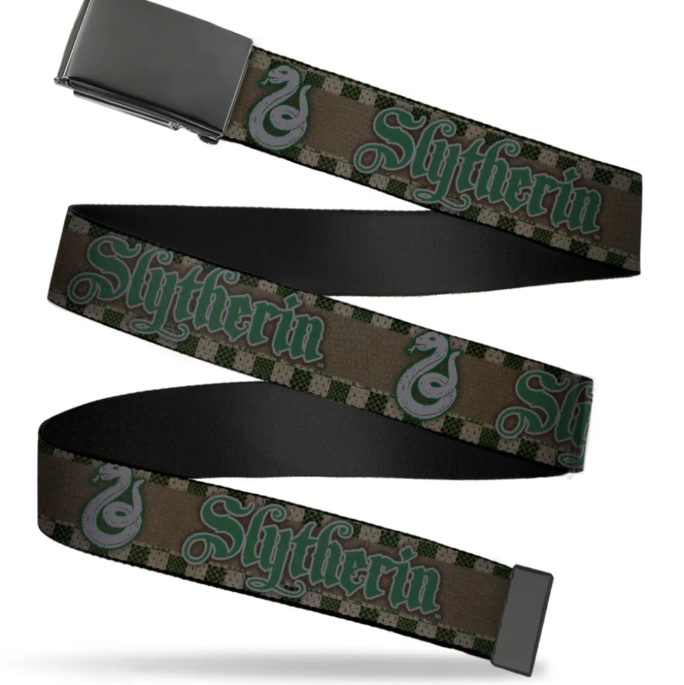 Black Buckle Web Belt – Harry Potter SLYTHERIN/Snake Checker Stripe Grays/Greens Webbing