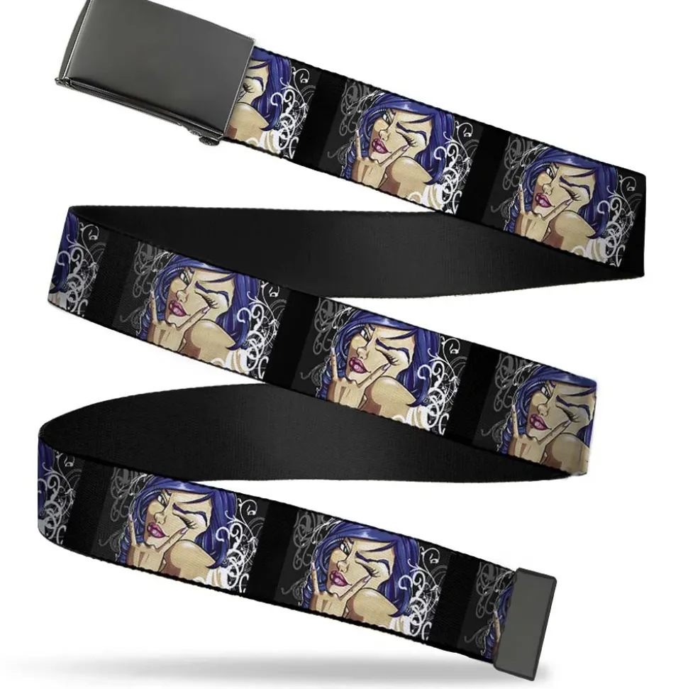 This unique web belt features a solid plain military-style clasp Buckle. It features beautiful artwork which is dyed into the fabric to ensure it looks great for years. This belt is available in 1.0″, 1.25″, and 1.5″ widths. 1.0″ wide belt is sized for children and adults with pants size 30 or lower. 1.25″ and 1.5″ wide belts are sized for adults, fitting up to pant size 42. This web belt is made from high-density nylon and steel. 1.5″ wide belt also has a bottle opener built into the back of the buckle! This product is Made in the USA by Buckle-Down Inc. and is officially licensed by Sexy Ink Girls.