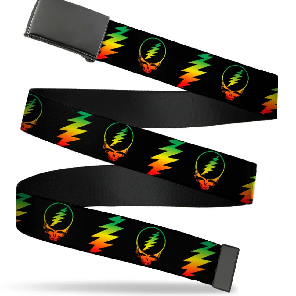 Black Buckle Web Belt – Steal Your Face w/Lightning Bolt Repeat Black/Rasta Webbing