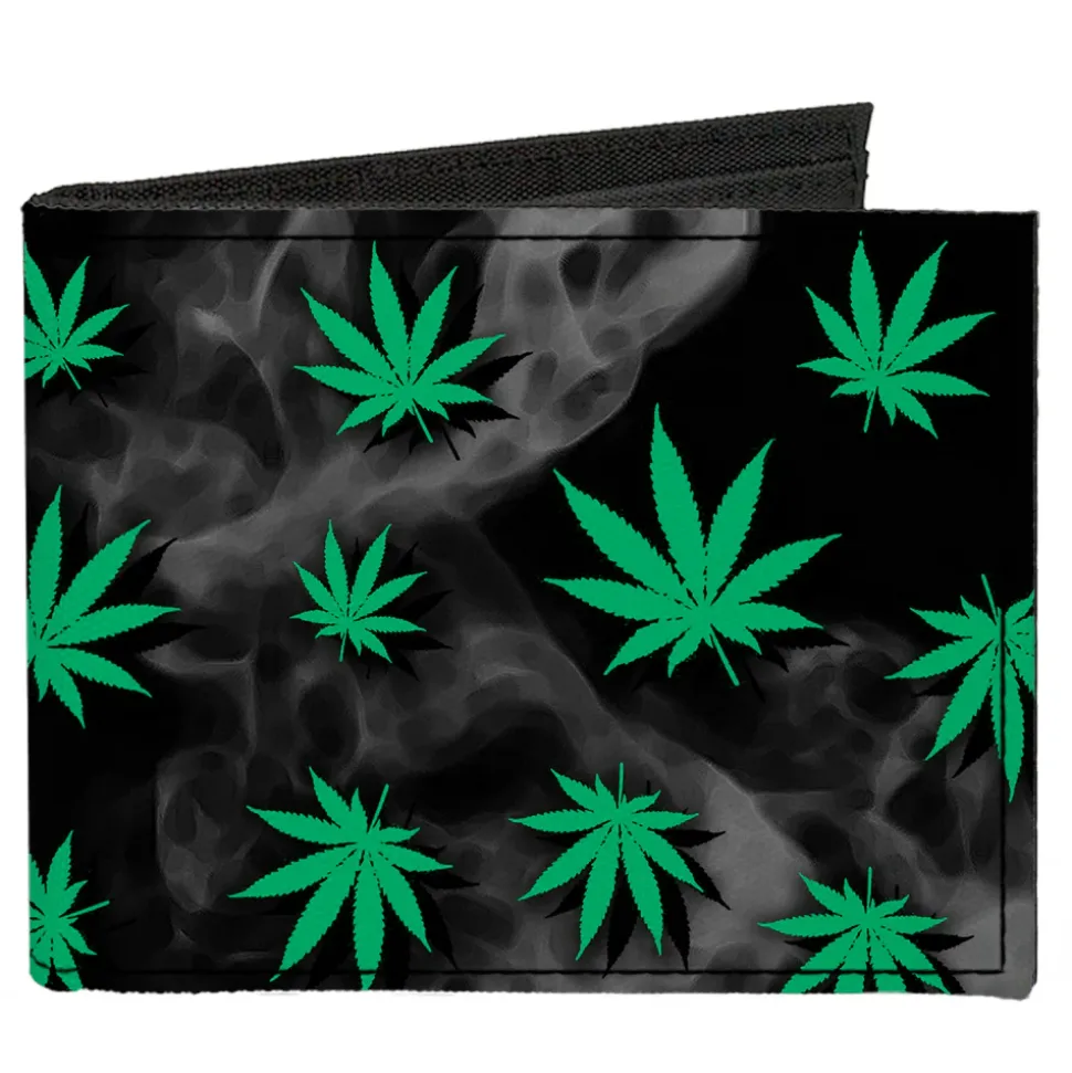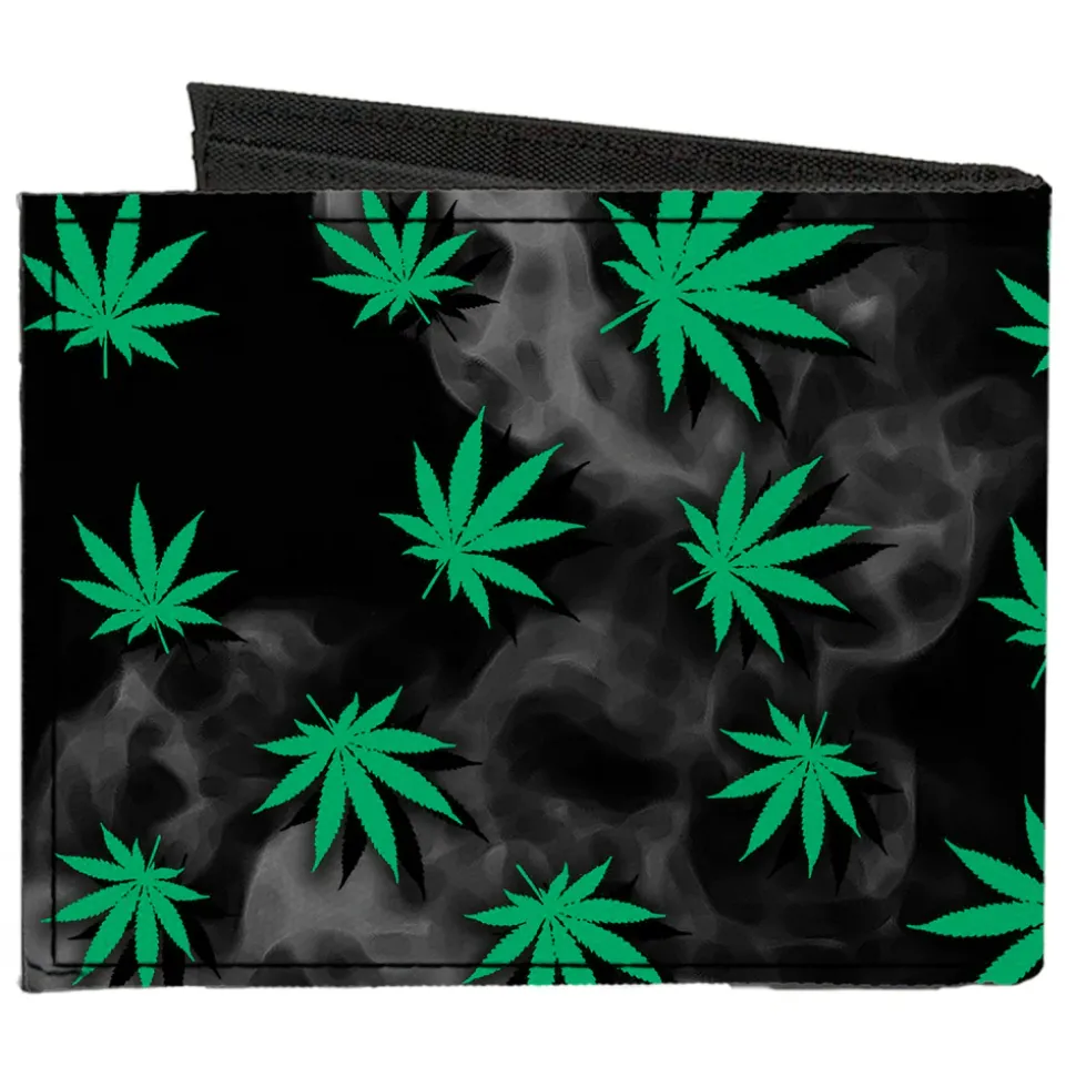 Canvas Bi-Fold Wallet – Pot Leaves Black Smoke Green