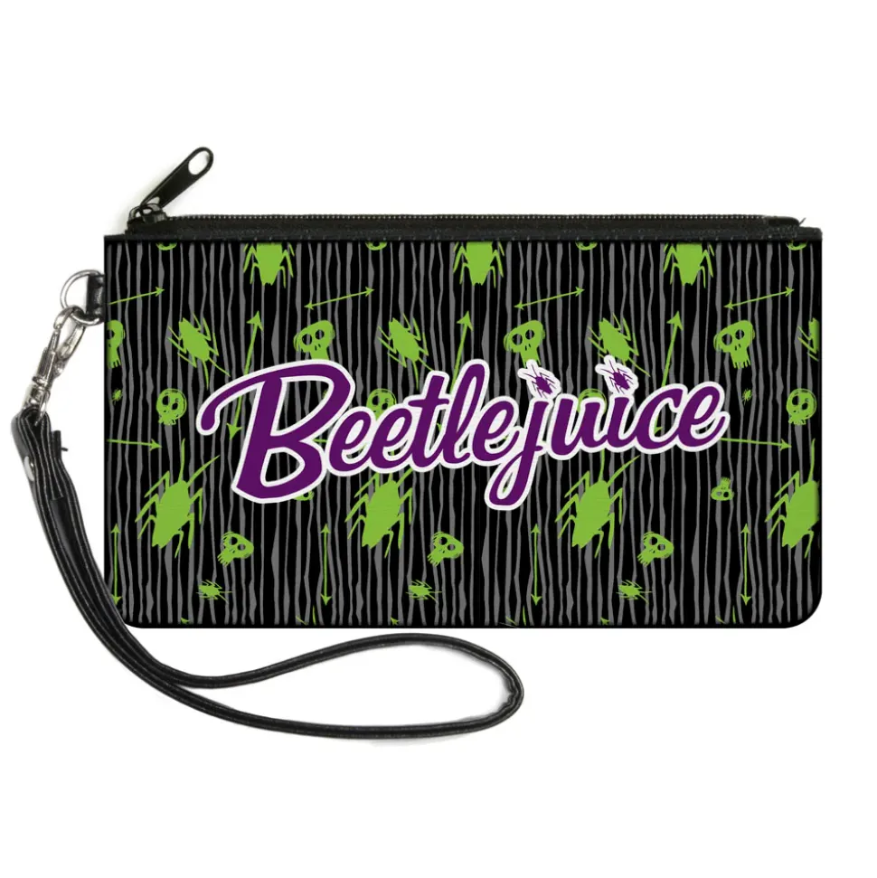 Canvas Zipper Wallet – SMALL – BEETLEJUICE Roach Skull Doodles Collage Black Gray Green Purple