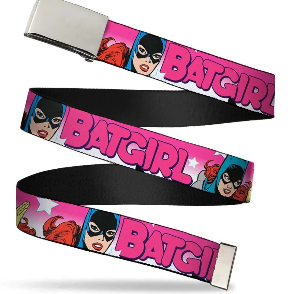 Chrome Buckle Web Belt – BATGIRL Bubble Letters w/Stars Pink/White Webbing