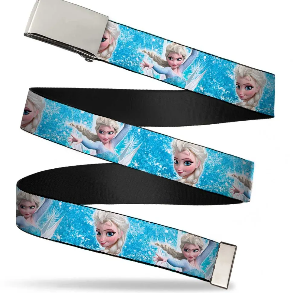 Chrome Buckle Web Belt – Frozen Elsa Face/Action Pose/Snowflakes Blues/White Webbing