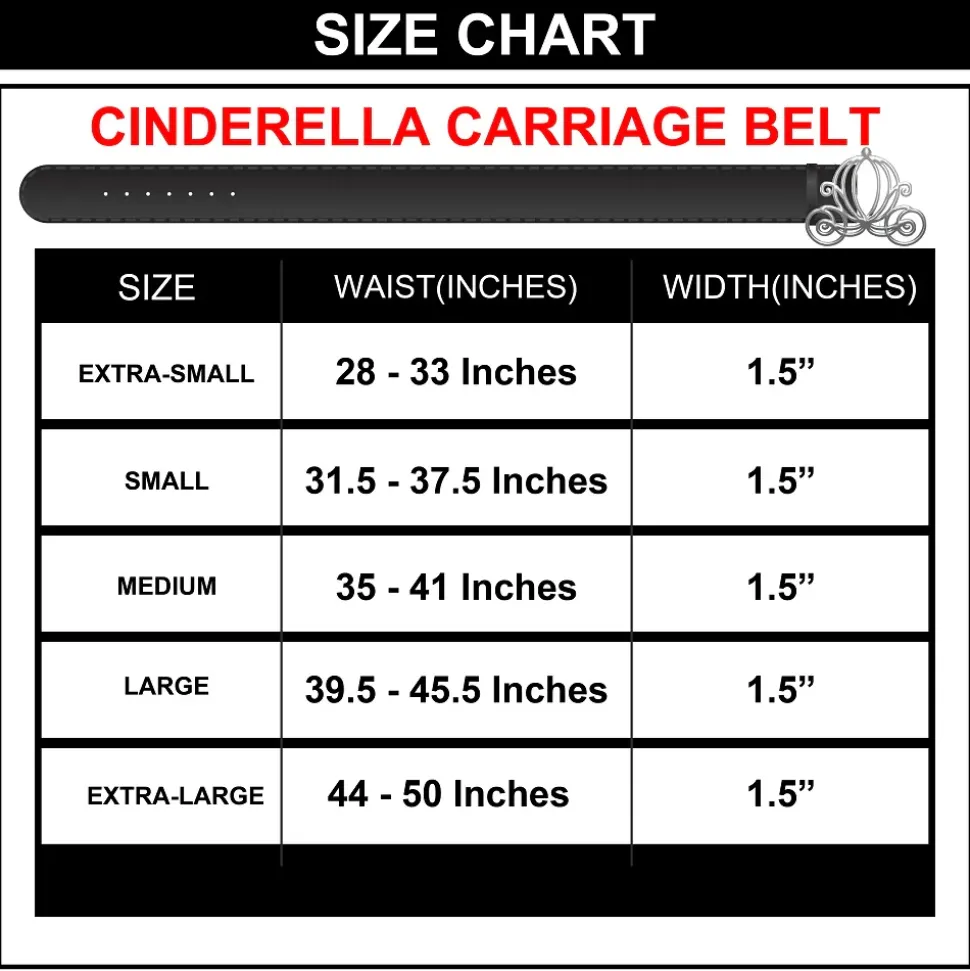 This awesome Disney logo belt is made from premium vegan leather and features an awesome Cinderella carriage buckle. This belt is 1.5 inches wide and comes in five sizes: Extra-Small, Small, Medium, Large and Extra-Large. Perfect addition to any ensemble requiring a waist belt, such as dresses, coats, and skirts! This belt does fit through pant loops. This product is Officially Licensed by Disney.