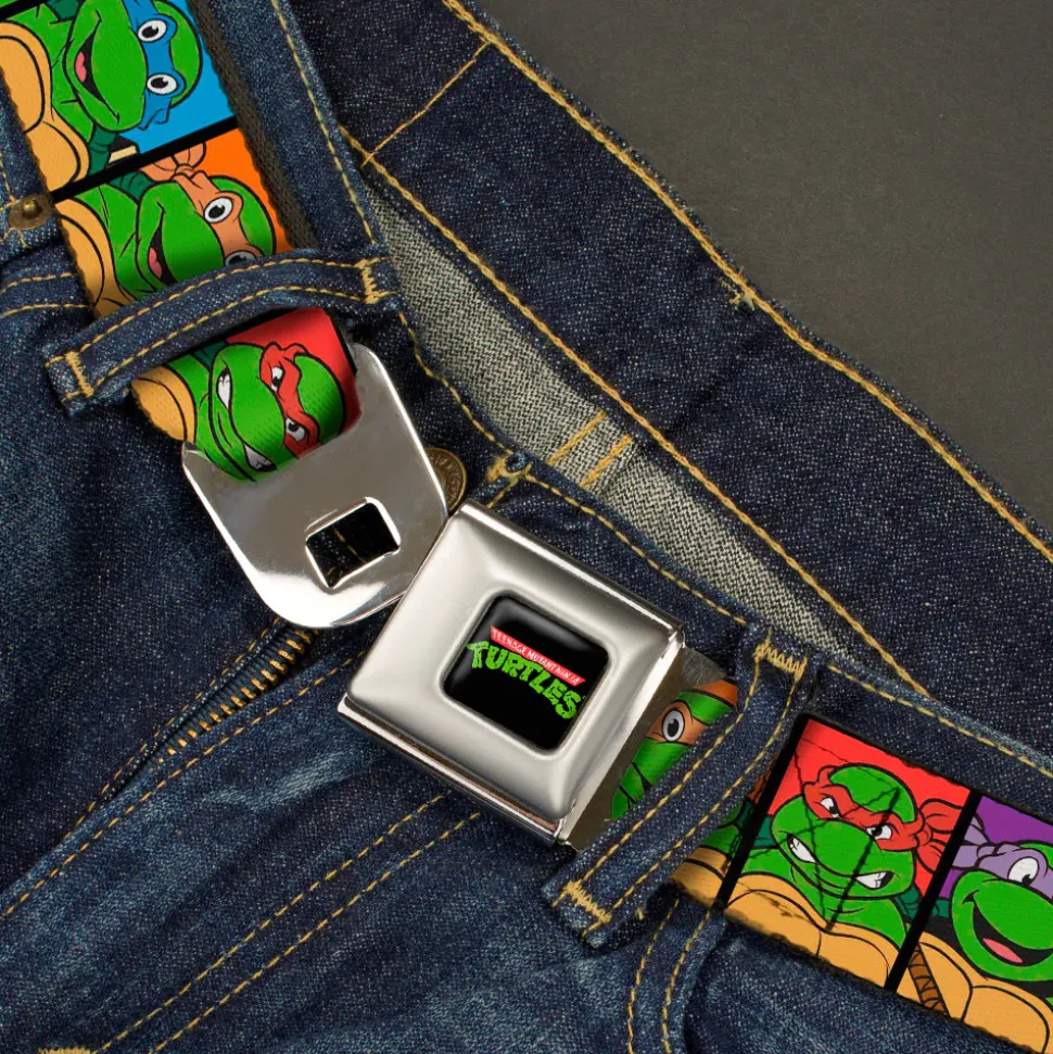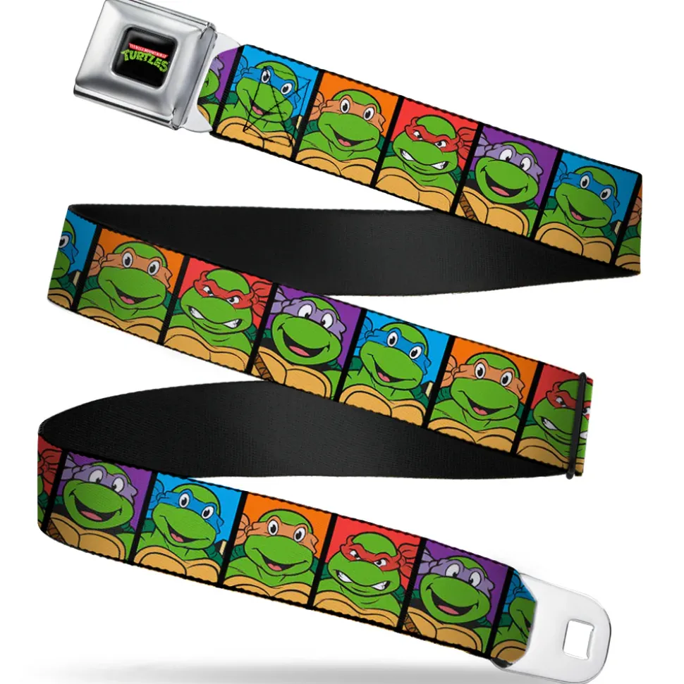 Classic TMNT Logo Full Color Seatbelt Belt – Classic Teenage Mutant Ninja Turtles Face Blocks Black/Multi Color Webbing