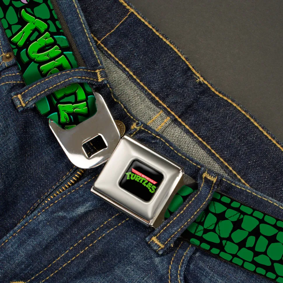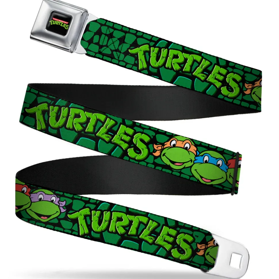 Classic TMNT Logo Full Color Seatbelt Belt – Classic Teenage Mutant Ninja Turtles Group Faces/TURTLES Turtle Shell Black/Green Webbing