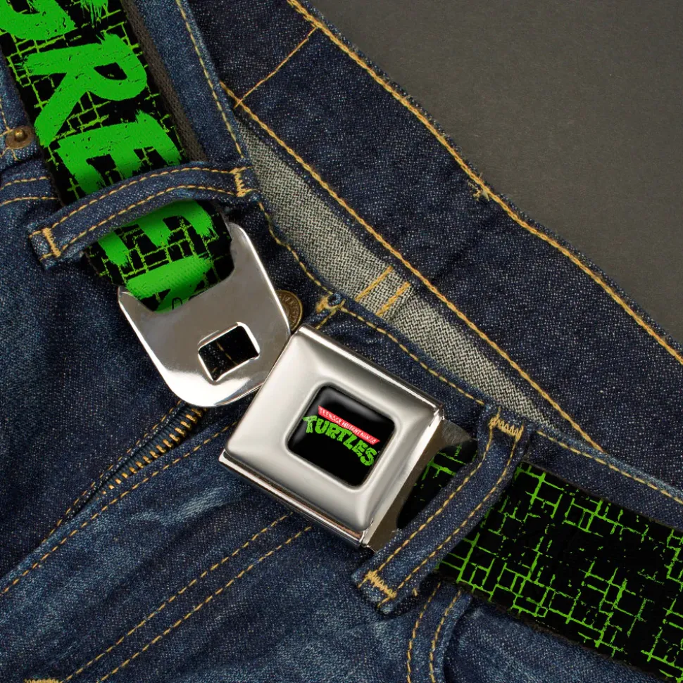 Classic TMNT Logo Full Color Seatbelt Belt – Classic TMNT Group Pose6/KEEPING IT LEAN, MEAN & GREEN Black/Green/White Webbing