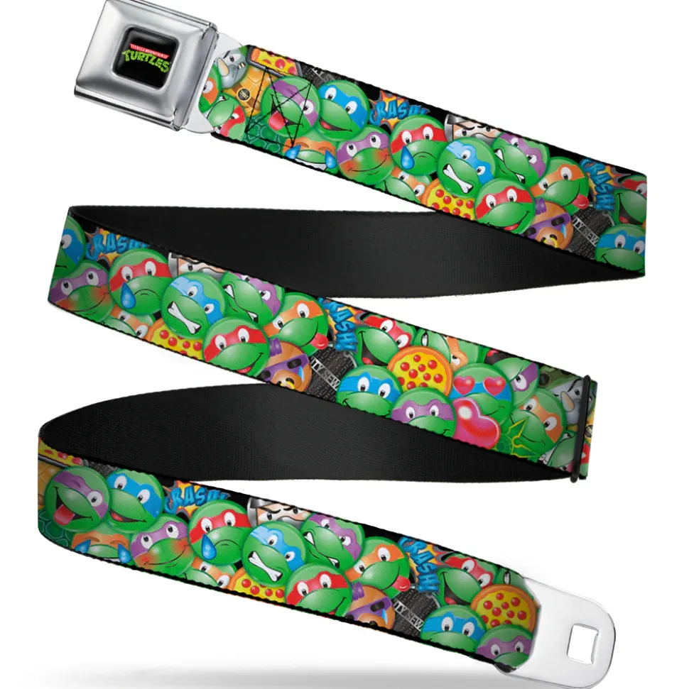 Classic TMNT Logo Full Color Seatbelt Belt – Classic TMNT Turtle Expressions/Pizza/Turtle Shell Buttons Stacked Webbing