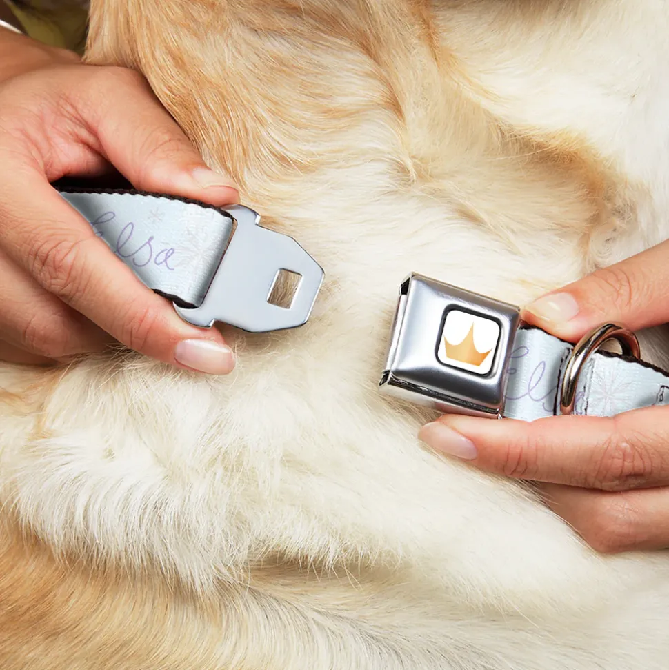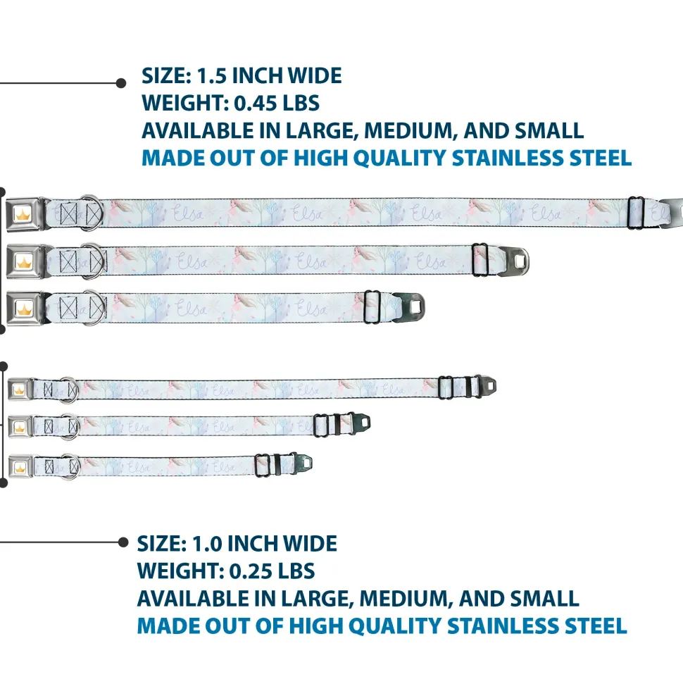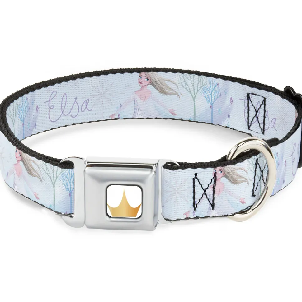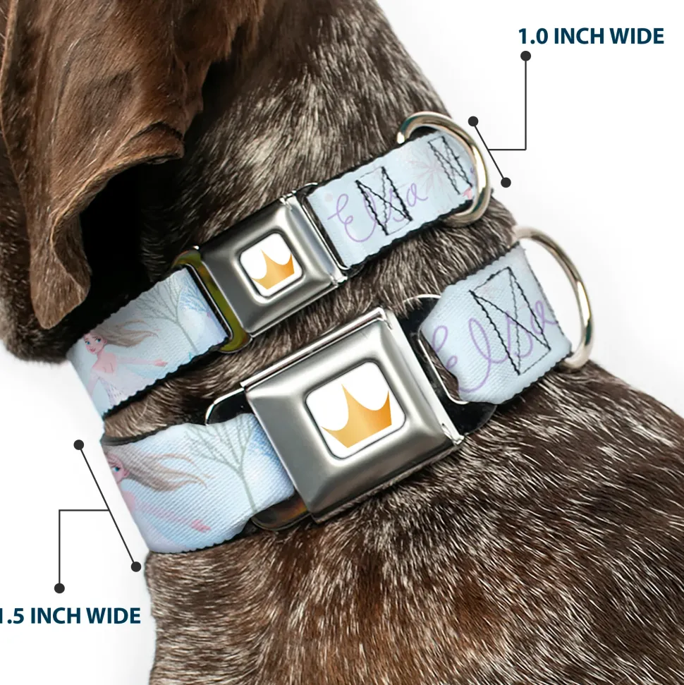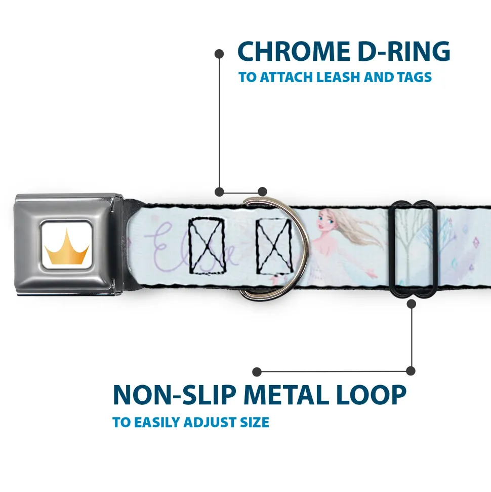 Disney Princess Crown Full Color Golds Seatbelt Buckle Collar – Frozen Elsa Snowflake Pose with Trees and Script Blues/Purples