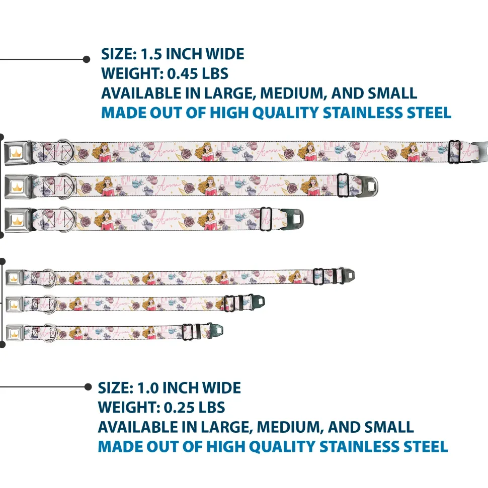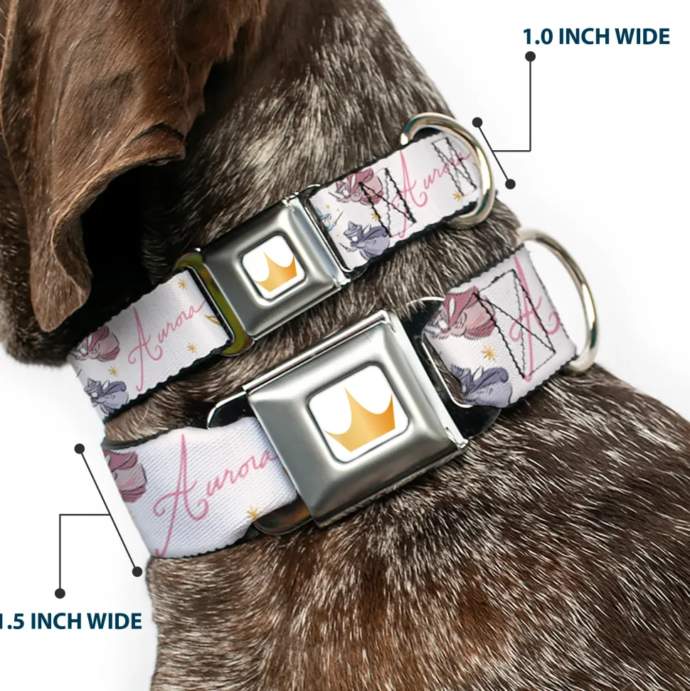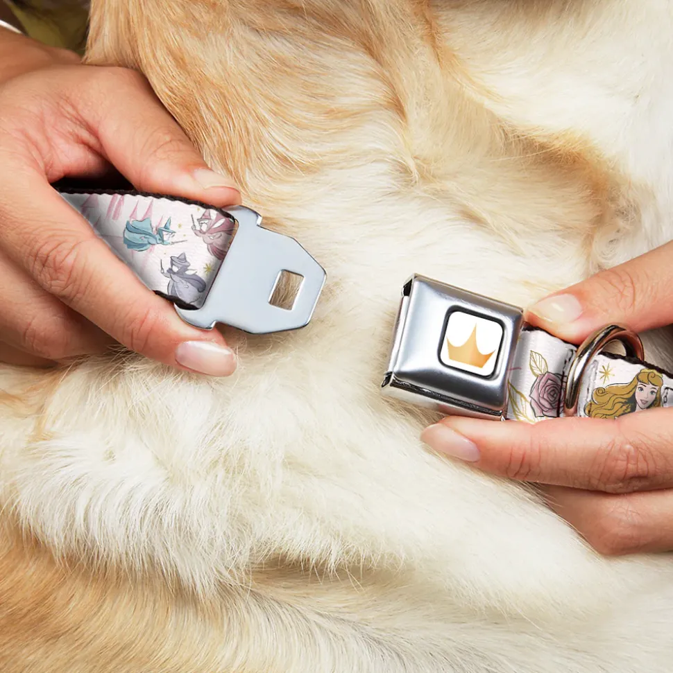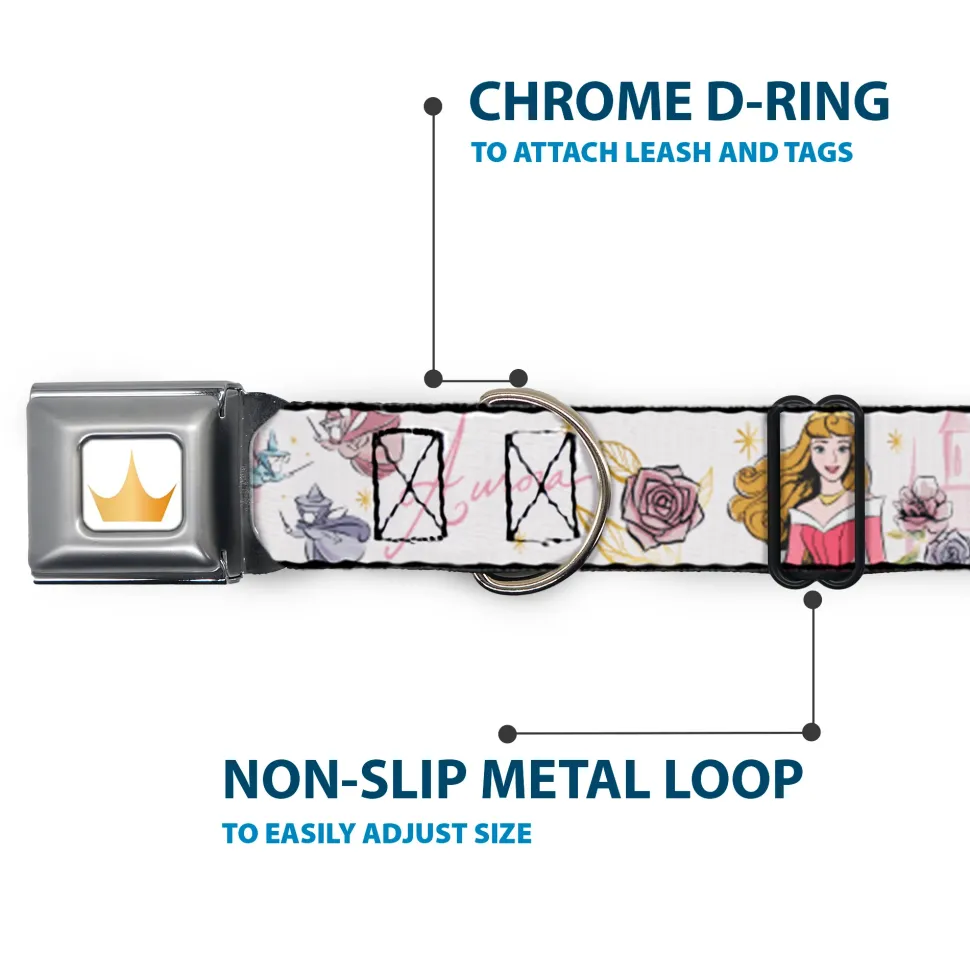 Disney Princess Crown Full Color Golds Seatbelt Buckle Collar – Sleeping Beauty Aurora Castle and Fairy Godmothers Pose with Script and Flowers White/Pinks