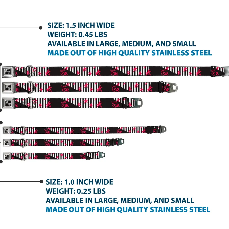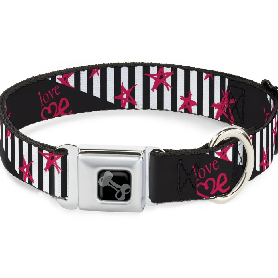 Dog Bone Black/Silver Seatbelt Buckle Collar – Love Me w/Sketch Stars & Stripes Black/White/Fuchsia