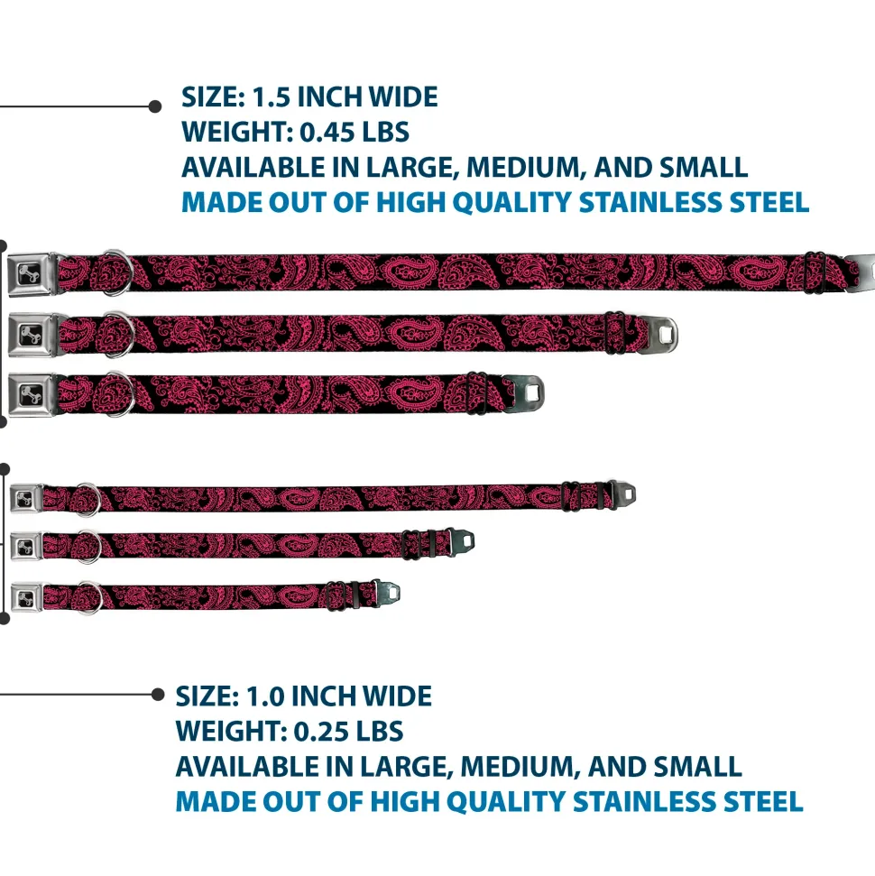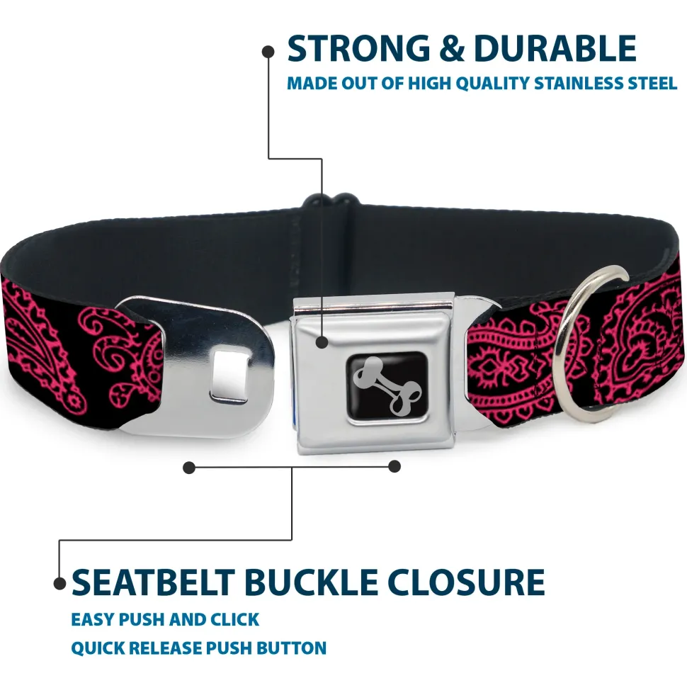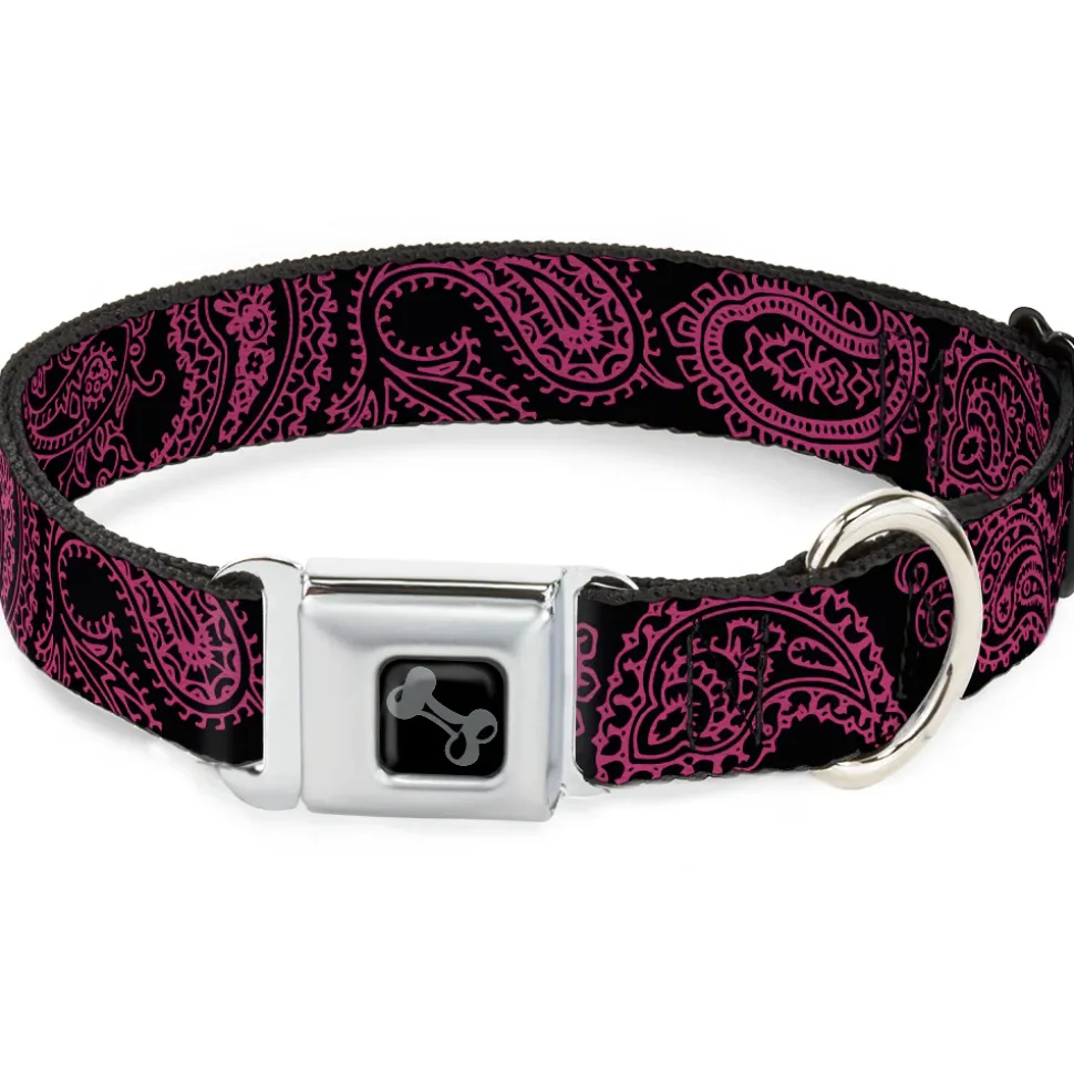 Dog Bone Black/Silver Seatbelt Buckle Collar – Paisley Black/Neon Pink