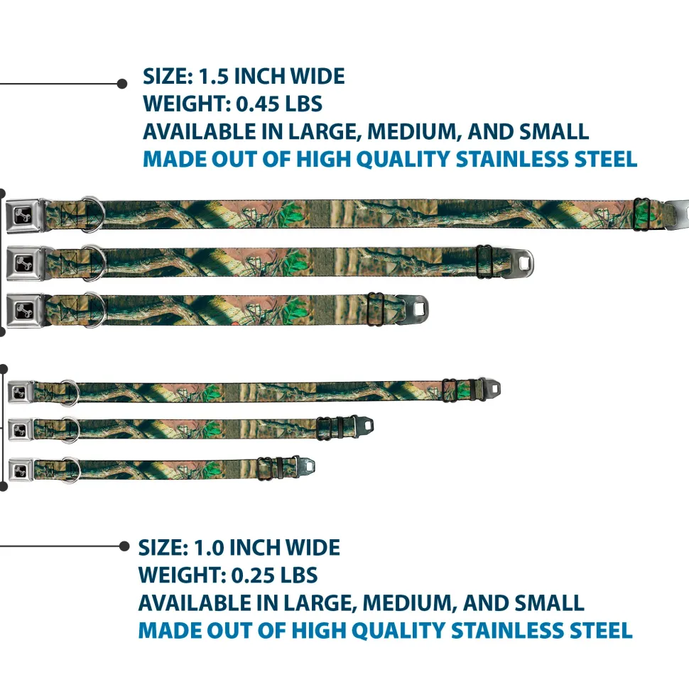Your dog will be the talk of the town when people notice they’re wearing this awesome SeatBelt Dog Collar! Made from high-density polyester and durable steel components, this collar is built to last. It features beautiful vibrant artwork. The buckle is a miniature authentic SeatBelt Buckle, so you press the center button to release the clasp. This product is Made in USA by Buckle-Down Inc. and officially licensed by Mossy Oak.