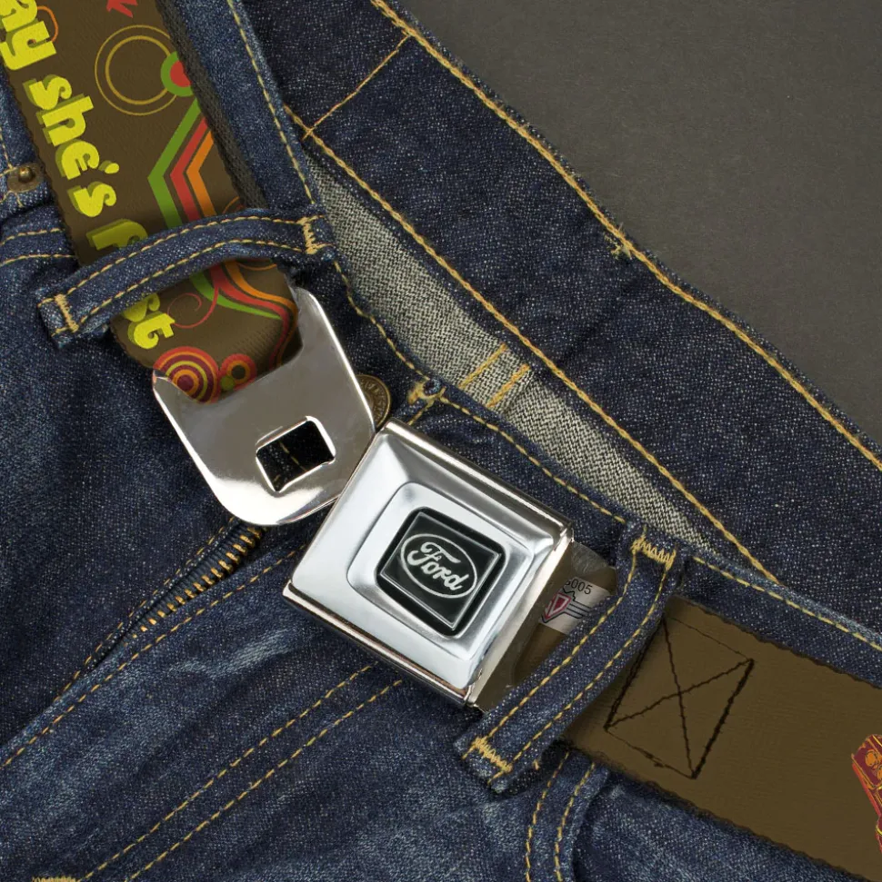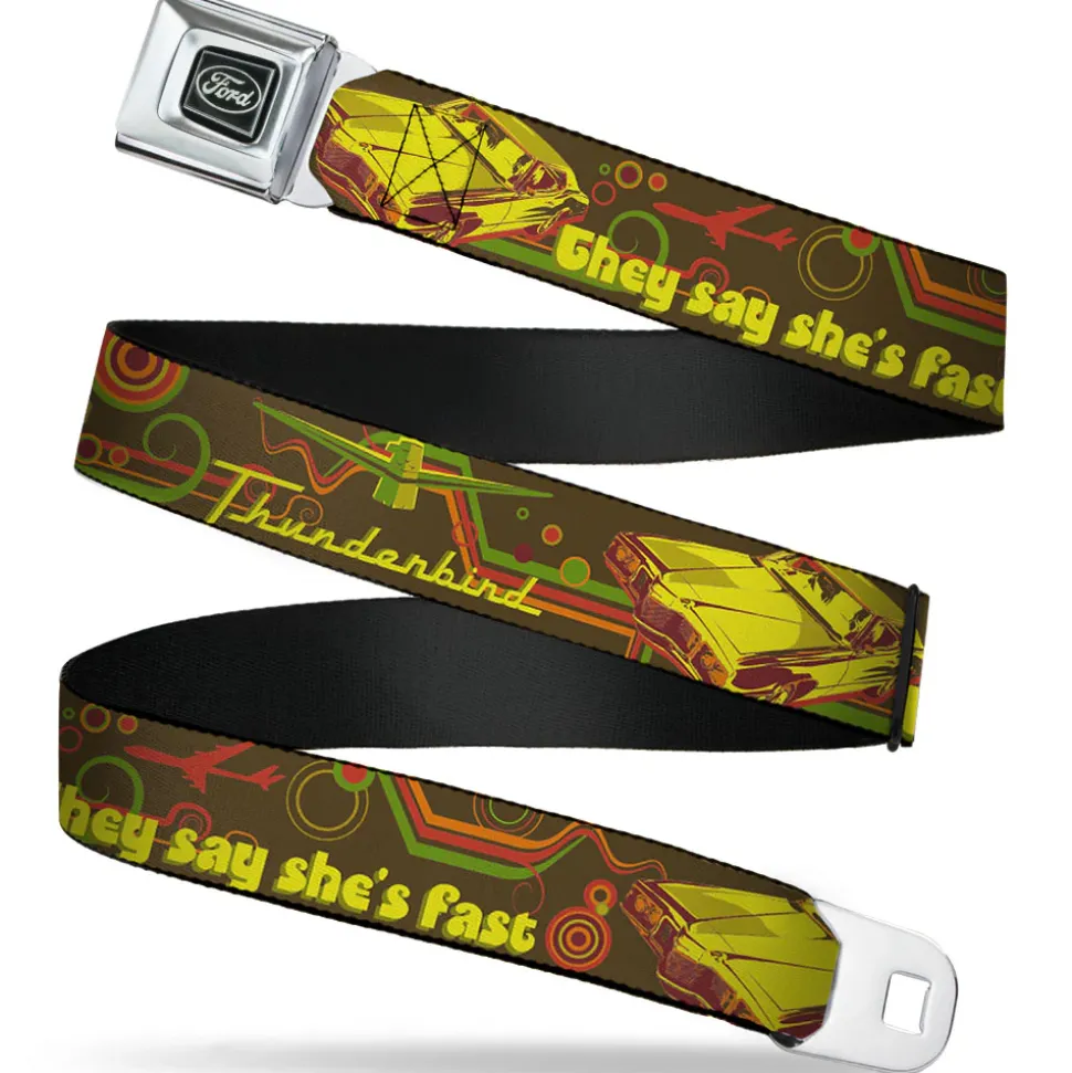 Ford Emblem Seatbelt Belt – Vintage Ford THUNDERBIRD-THEY SAY SHE'S FAST Browns/Yellows Webbing