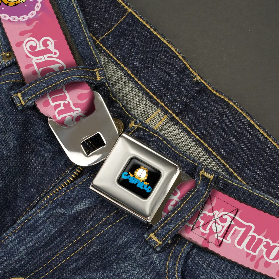 Garfield Smiling Face and Text Logo Full Color Black Seatbelt Belt – Garfield HEART THROB Flames Pose Valentine Pinks Webbing