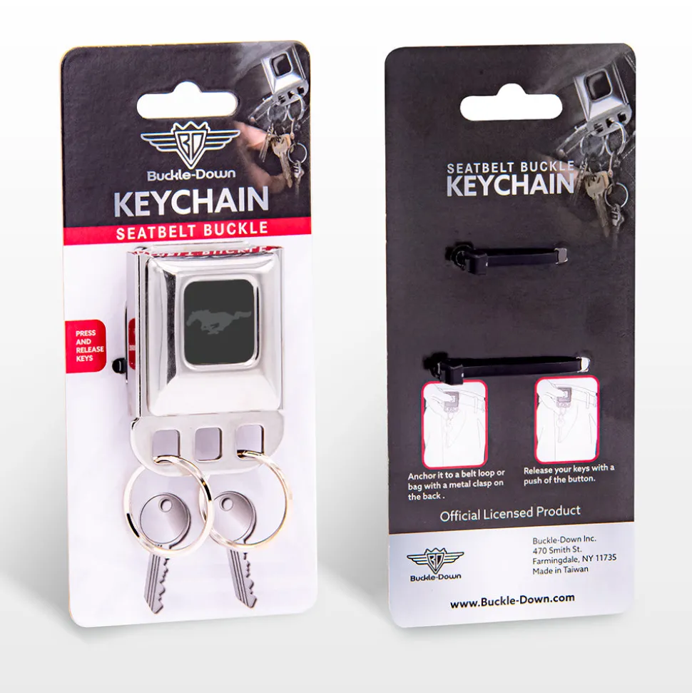This nifty keychain is equipped with an authentic SeatBelt Buckle clasp. You can anchor it to a belt loop or bag with a metal clasp on the back and conveniently detach your keys by pressing the center button. This keychain measures 3.0×2.0x1.0 Inches, and is made from chrome-plated steel components. SeatBelt Keychain with functional SeatBelt release mechanism! This patented (D542,523) keychain is made by Buckle-Down and is officially licensed by Ford.