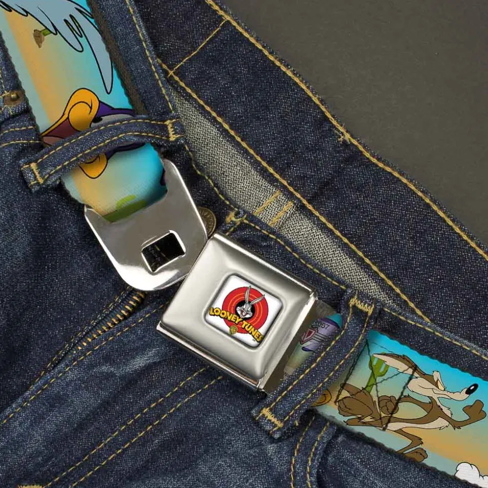 Looney Tunes Logo Full Color White Seatbelt Belt – Road Runner/Wile E. Coyote Scene1 Desert Webbing