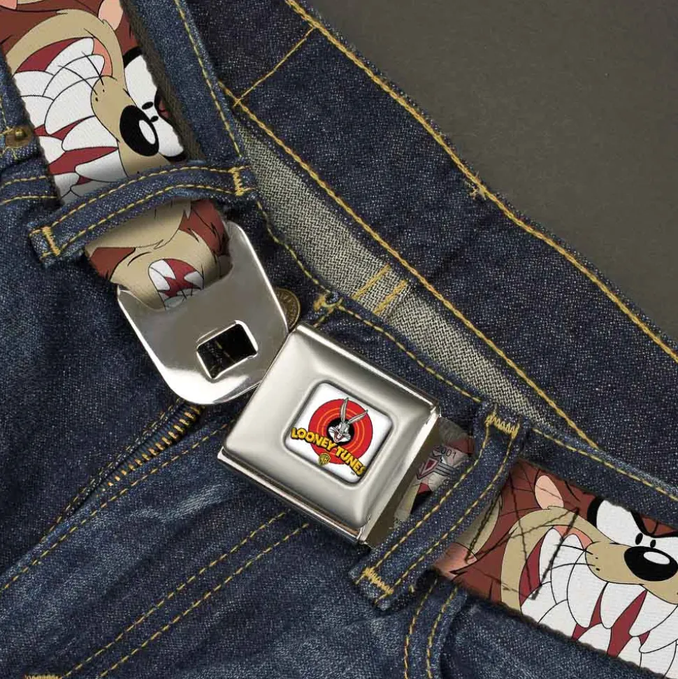 Looney Tunes Logo Full Color White Seatbelt Belt – Tasmanian Devil Expressions Brown Webbing