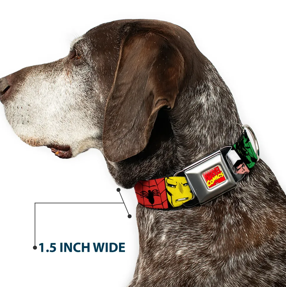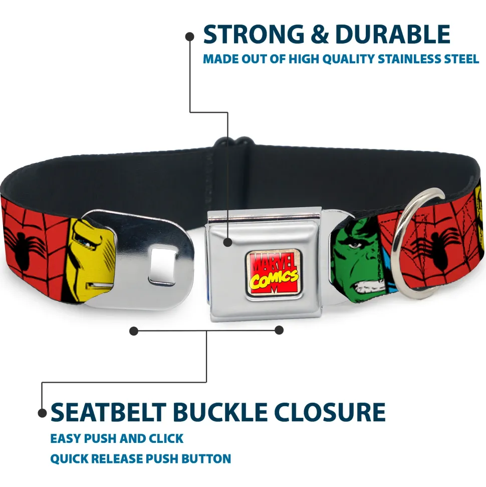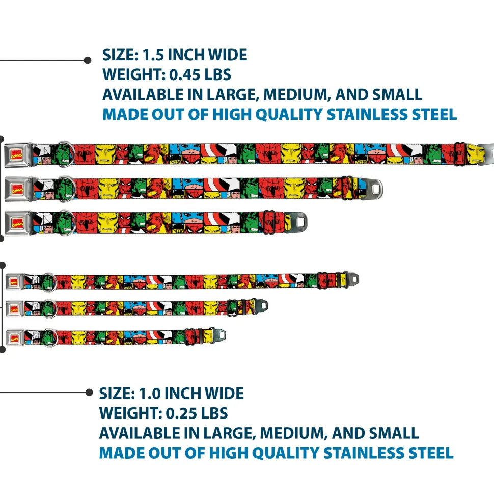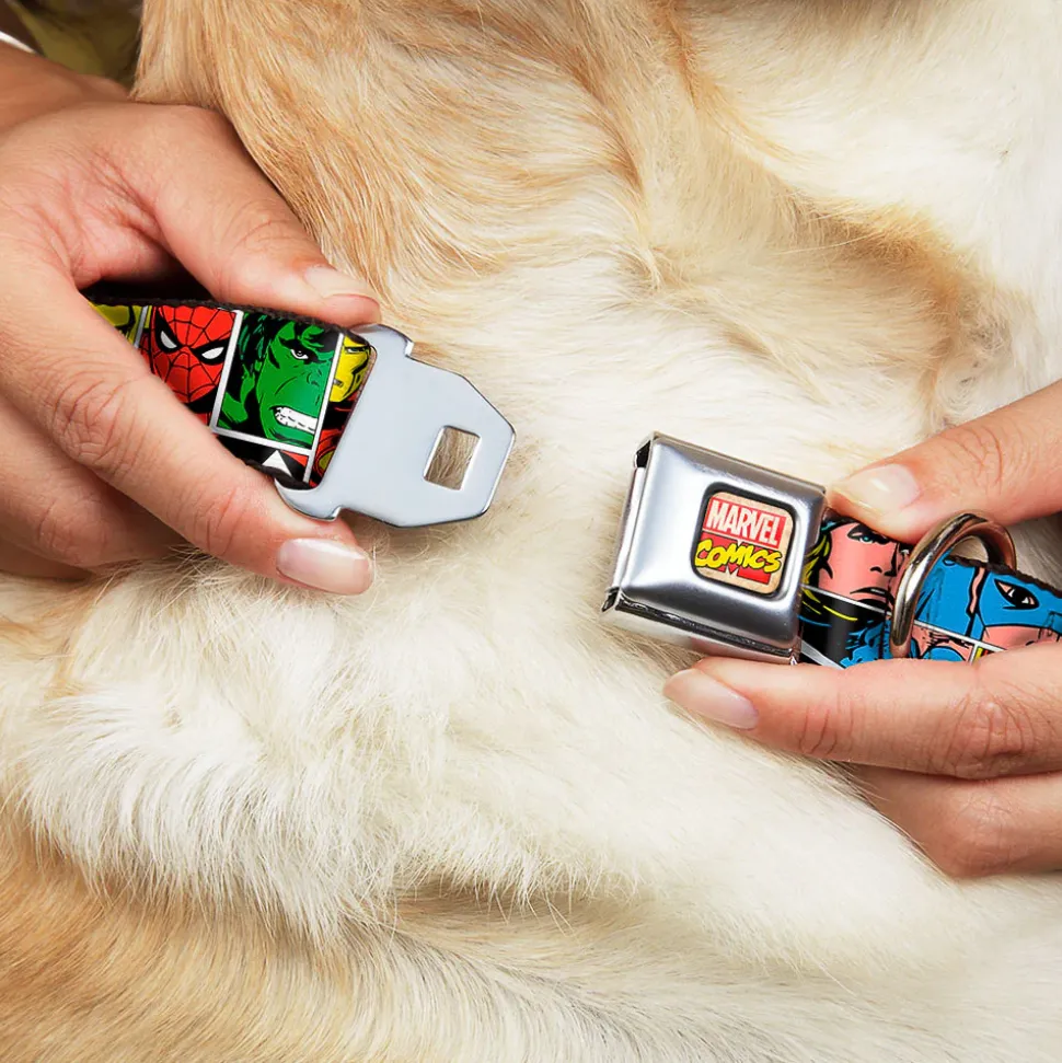 Your dog will be the talk of the town when people notice they’re wearing this awesome SeatBelt Dog Collar! Made from high-density polyester and durable steel components, this collar is built to last. It features beautiful vibrant artwork. The buckle is a miniature authentic SeatBelt Buckle, so you press the center button to release the clasp. This product is Made in USA by Buckle-Down Inc. and officially licensed by Marvel Comics.