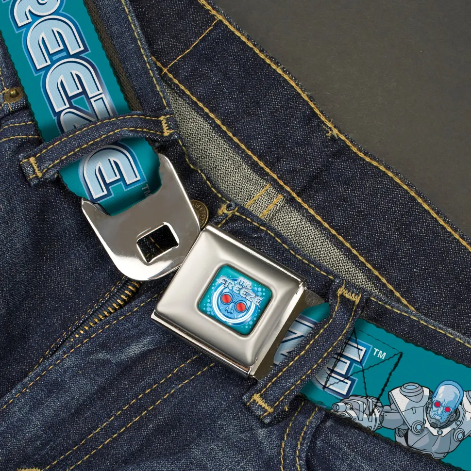 MR. FREEZE Title Logo and Face Full Color Blues Seatbelt Belt – DC Batman Villain MR. FREEZE Poses and Title Logo Blues Webbing