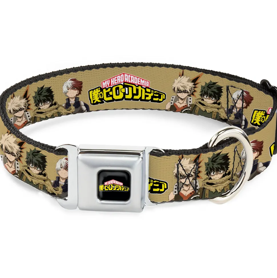 MY HERO ACADEMIA Title Logo Full Color Black Seatbelt Buckle Collar – MY HERO ACADEMIA Character Trio Pose and Title Logo Tan