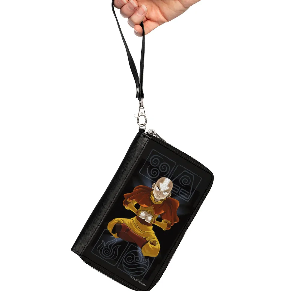 PU Zip Around Wallet Rectangle – Avatar the Last Airbender Aang Meditating Pose Bending Elements Icons Black Grays