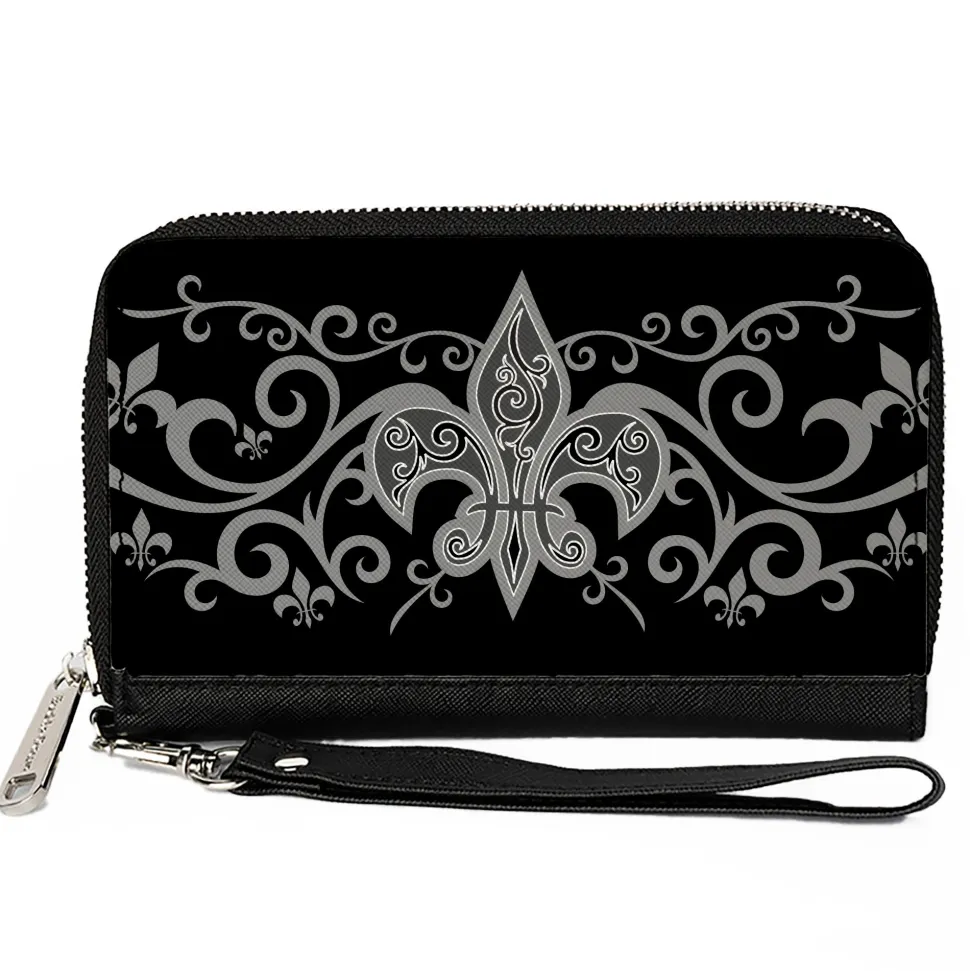 PU Zip Around Wallet Rectangle – Fleur-de-Lis w/Filigree Black/Gray