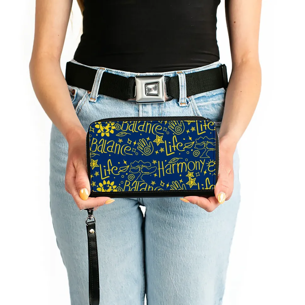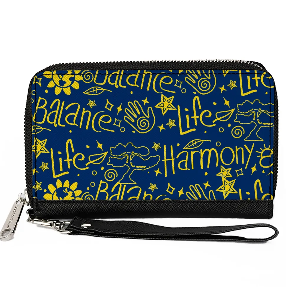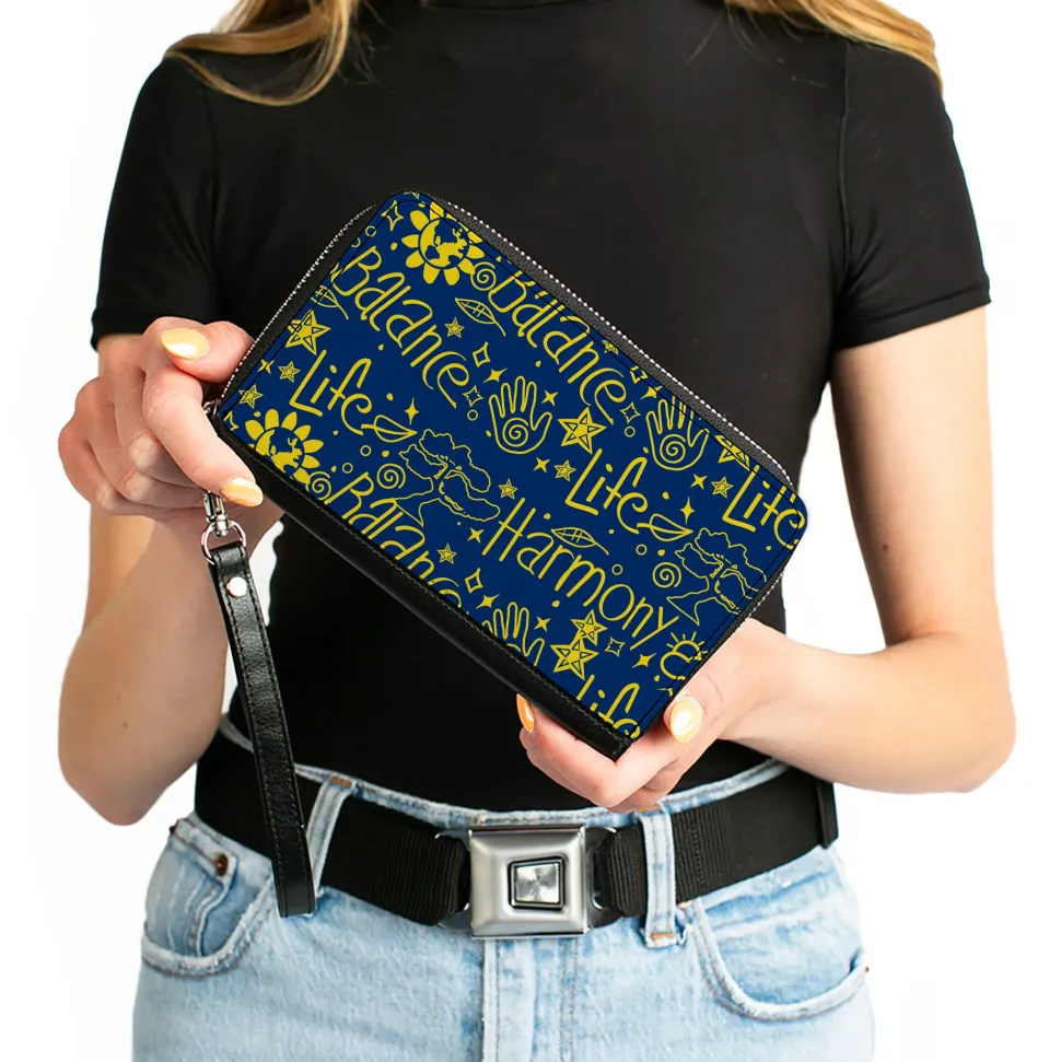 PU Zip Around Wallet Rectangle - HARMONY BALANCE LIFE Icons Collage Blue/Yellow