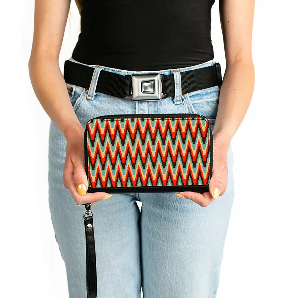 PU Zip Around Wallet Rectangle - Jagged Zig Zag Brown/Aqua/Cream/Red