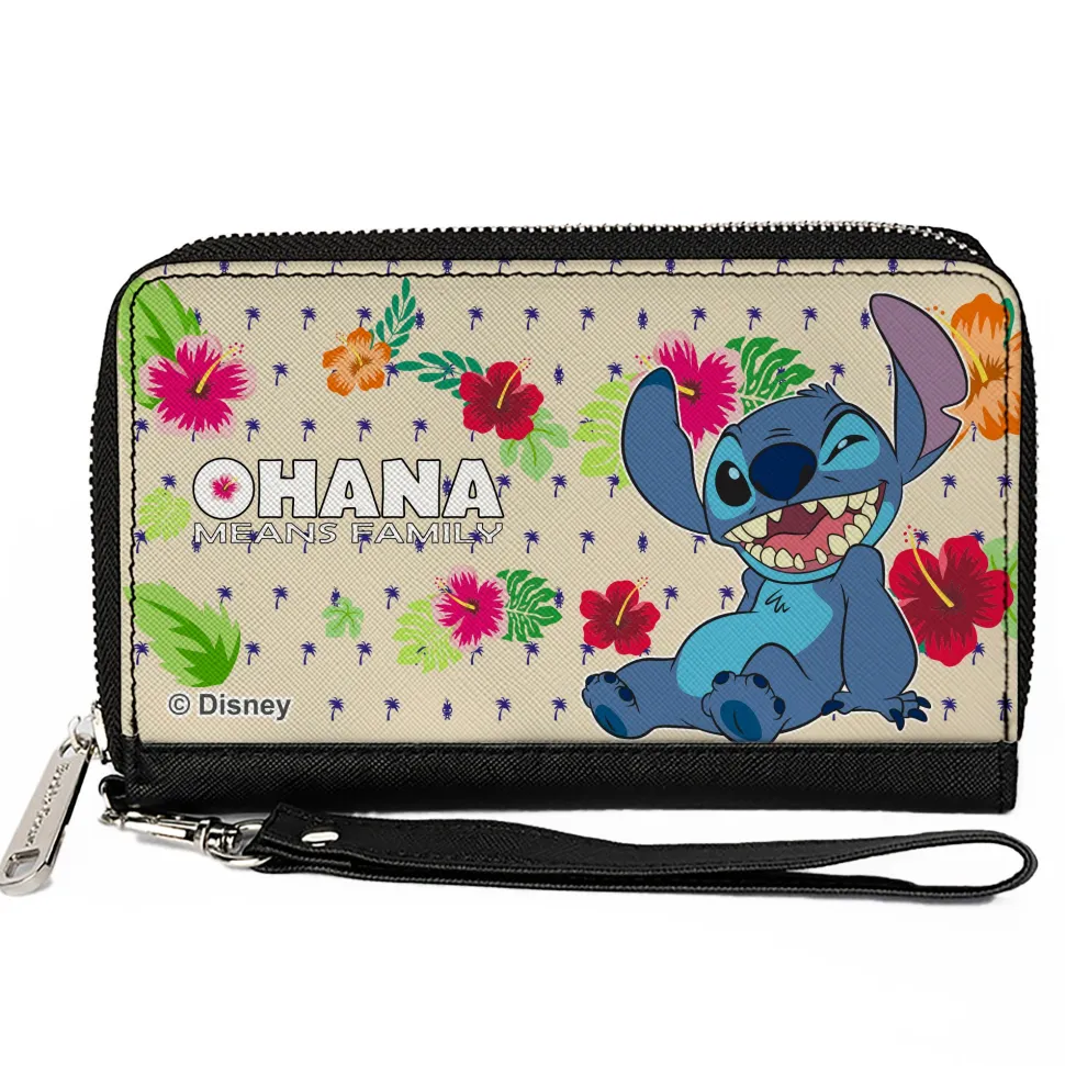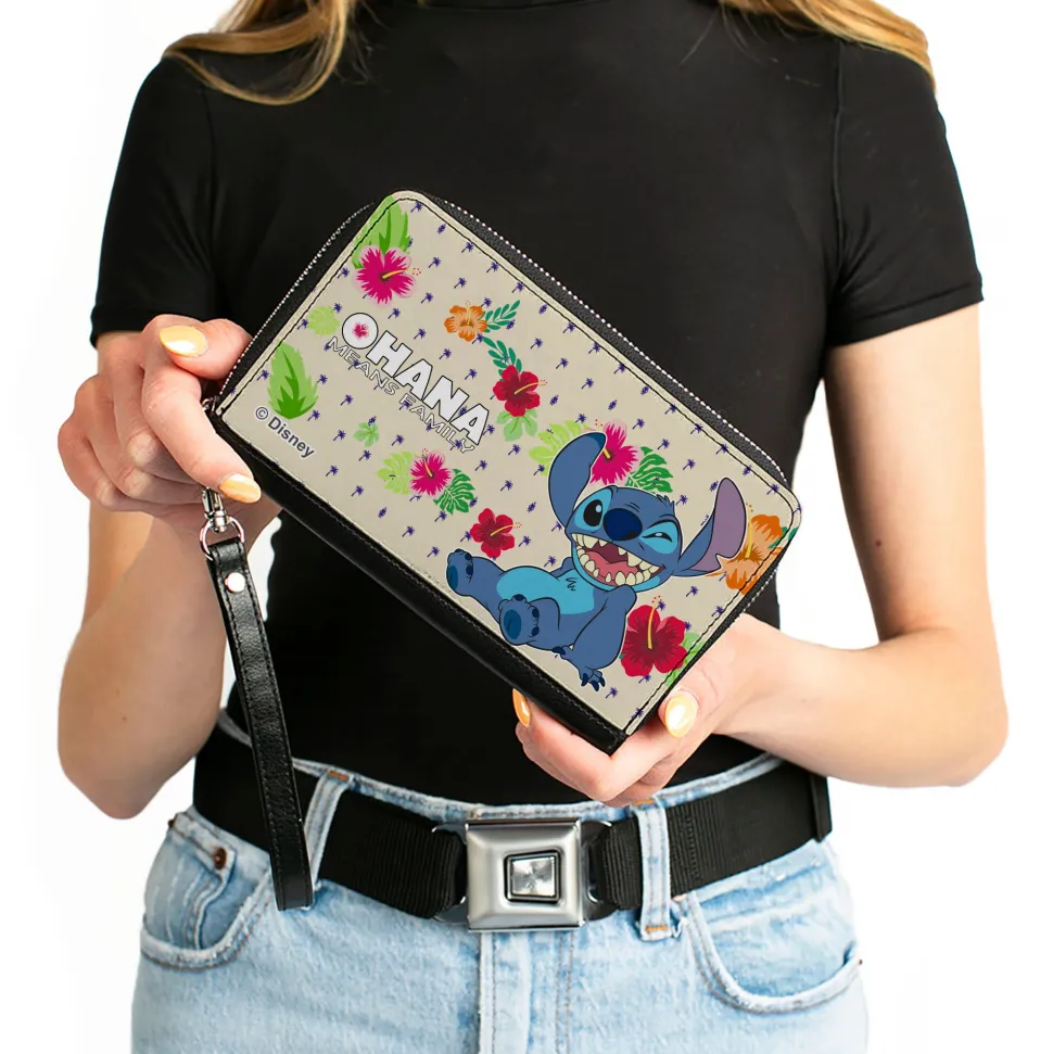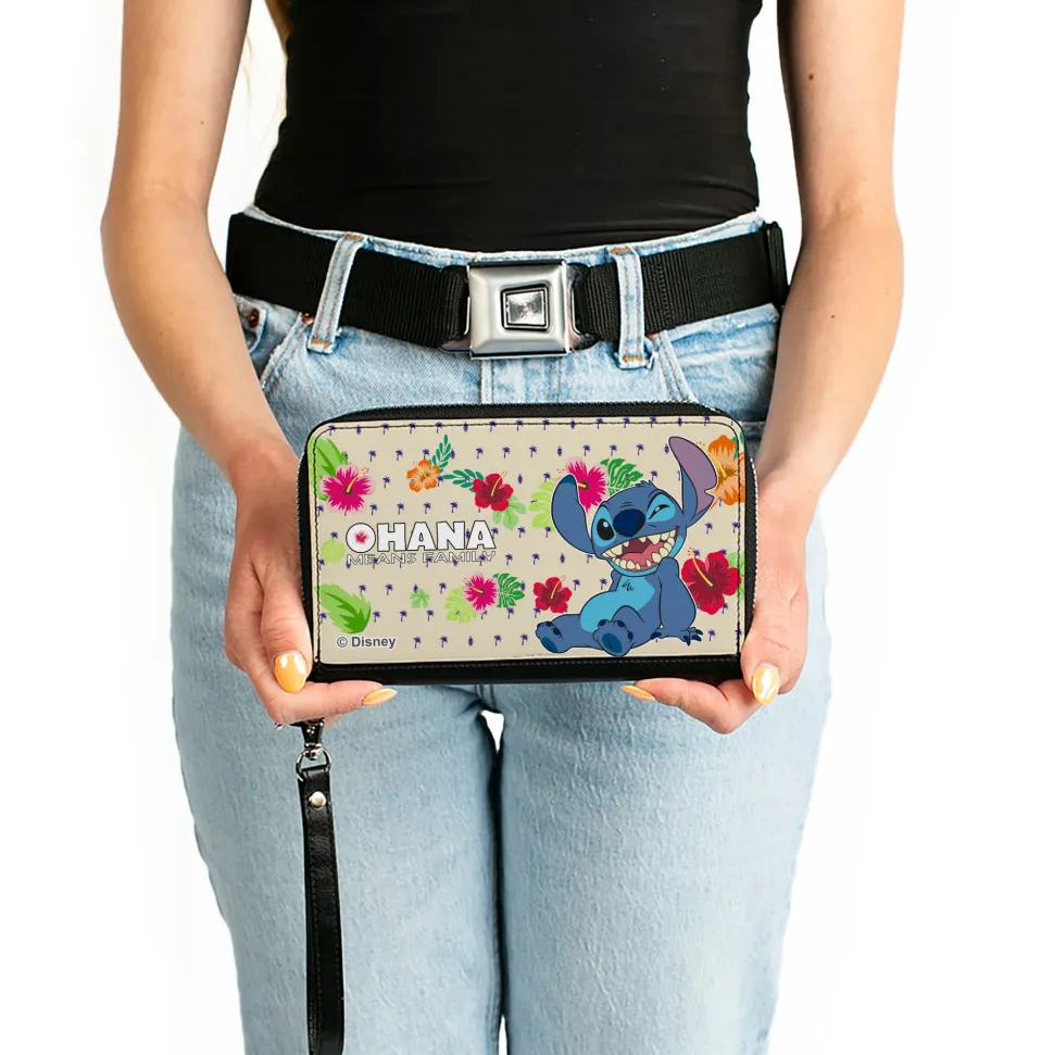 PU Zip Around Wallet Rectangle – Lilo & Stitch Stitch Winking Pose OHANA MEANS FAMILY Tropical Flora Cream/Multi Color