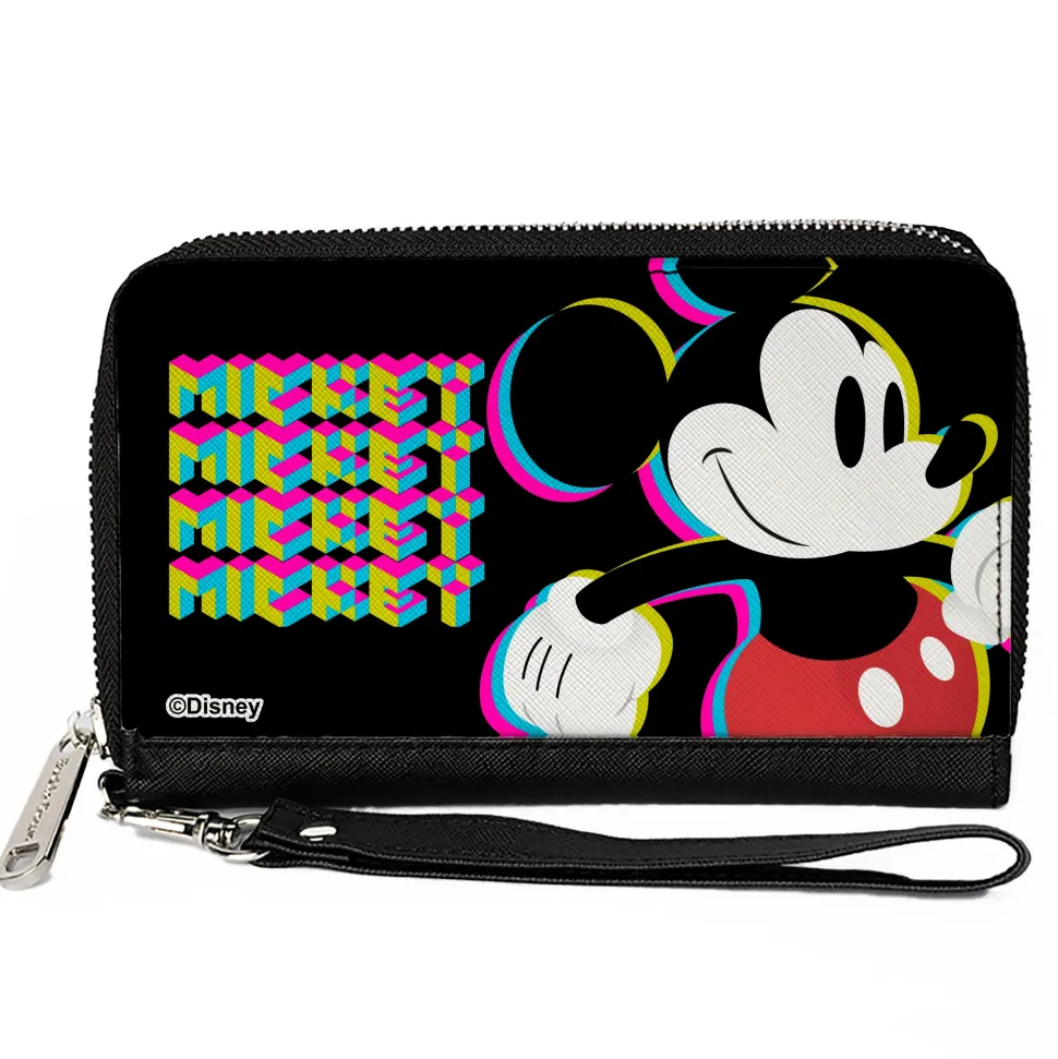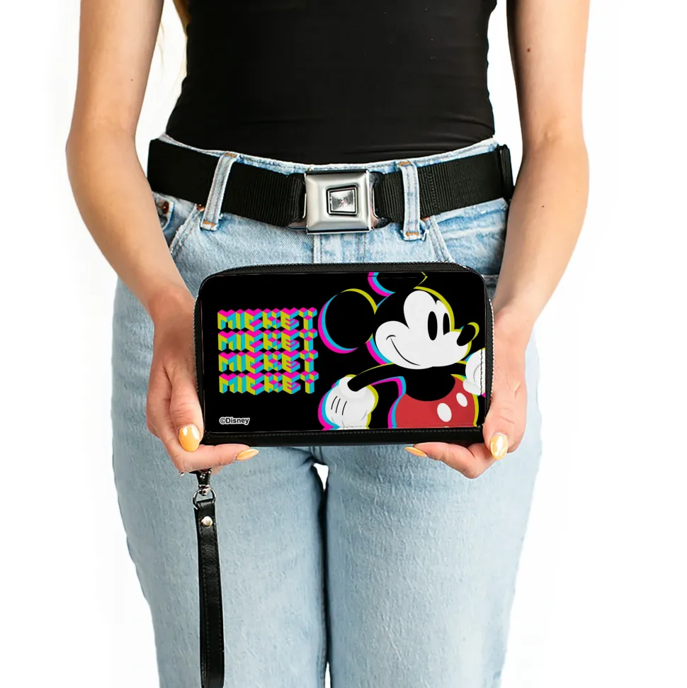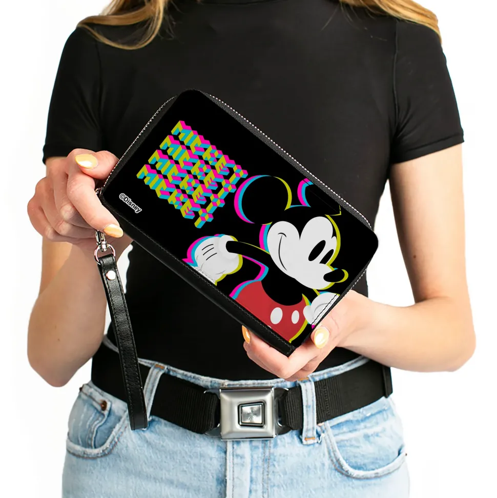 PU Zip Around Wallet Rectangle – MICKEY MOUSE Walking Pose and Pixel Text Black/Multi Neon