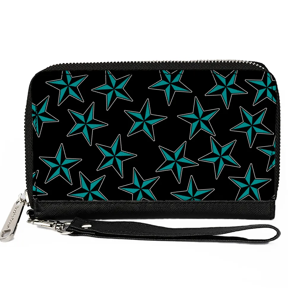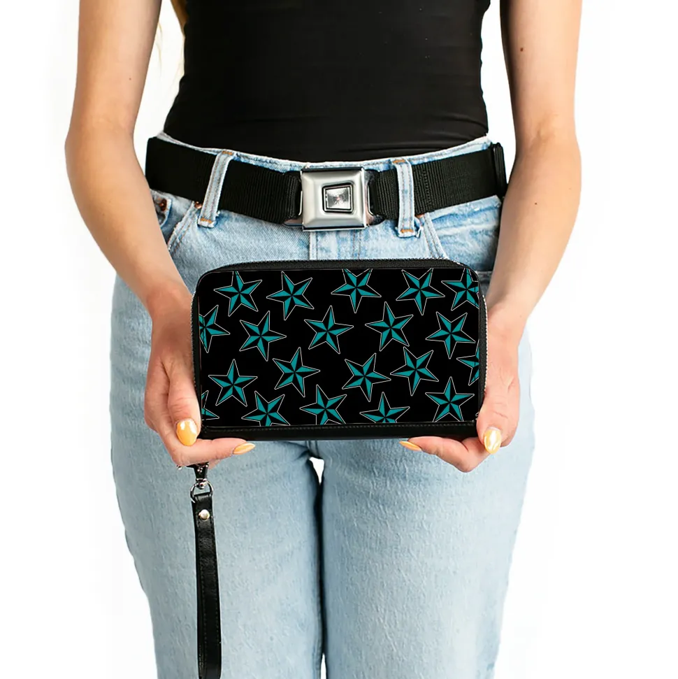 PU Zip Around Wallet Rectangle – Nautical Stars Scattered Black/Turquoise