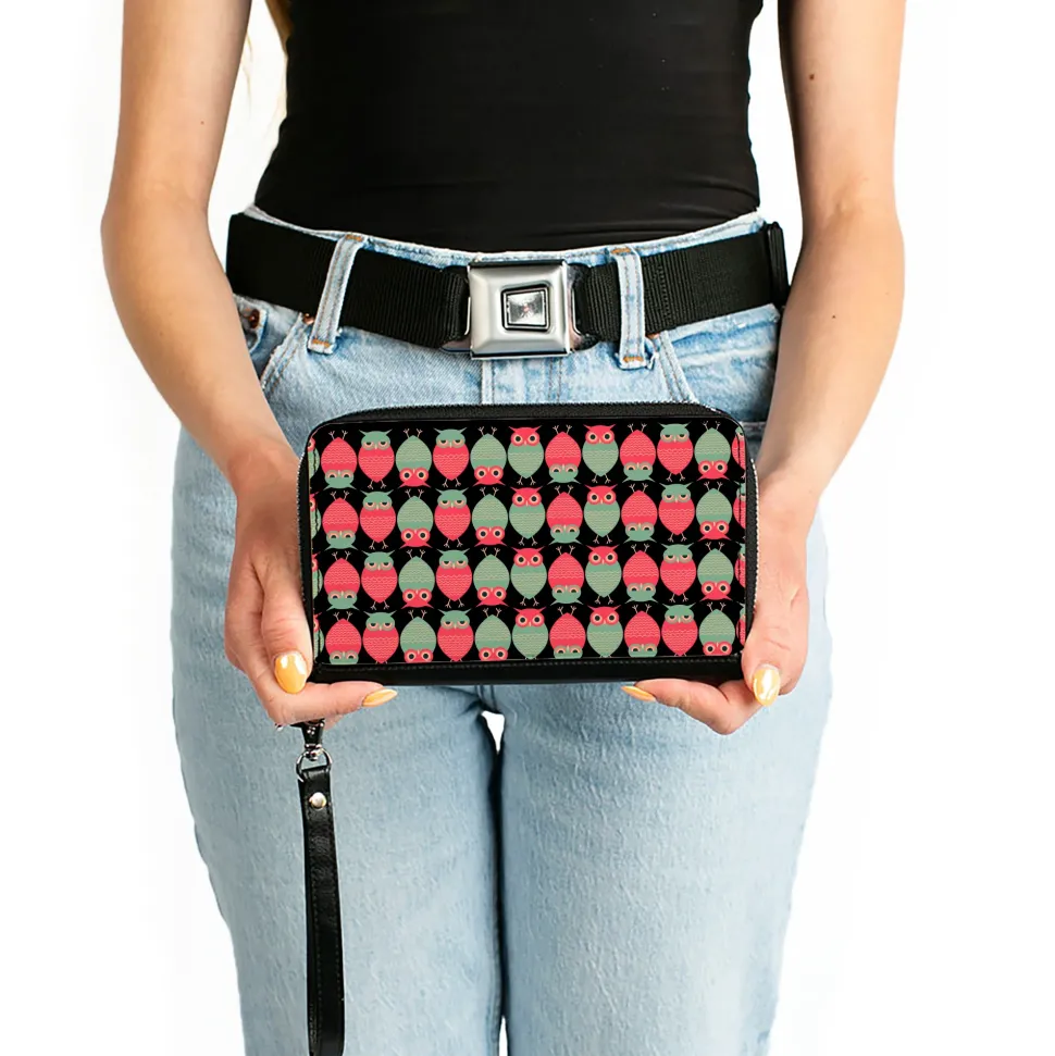 PU Zip Around Wallet Rectangle – Owls Flip Black/Mauve/Sage