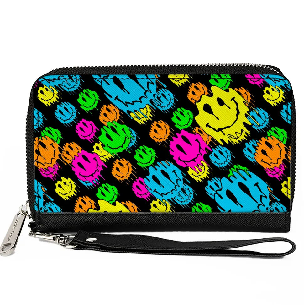 PU Zip Around Wallet Rectangle – Smiley Faces Melted Stacked Black Multi Neon