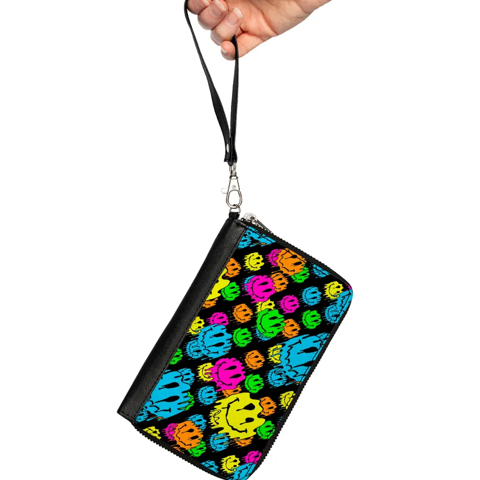 PU Zip Around Wallet Rectangle - Smiley Faces Melted Stacked Black Multi Neon