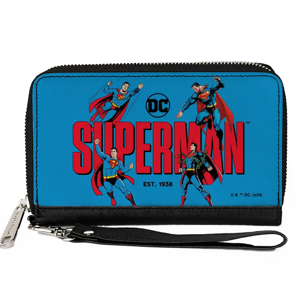 PU Zip Around Wallet Rectangle – SUPERMAN EST 1938 Action Poses and Text Blue/Red
