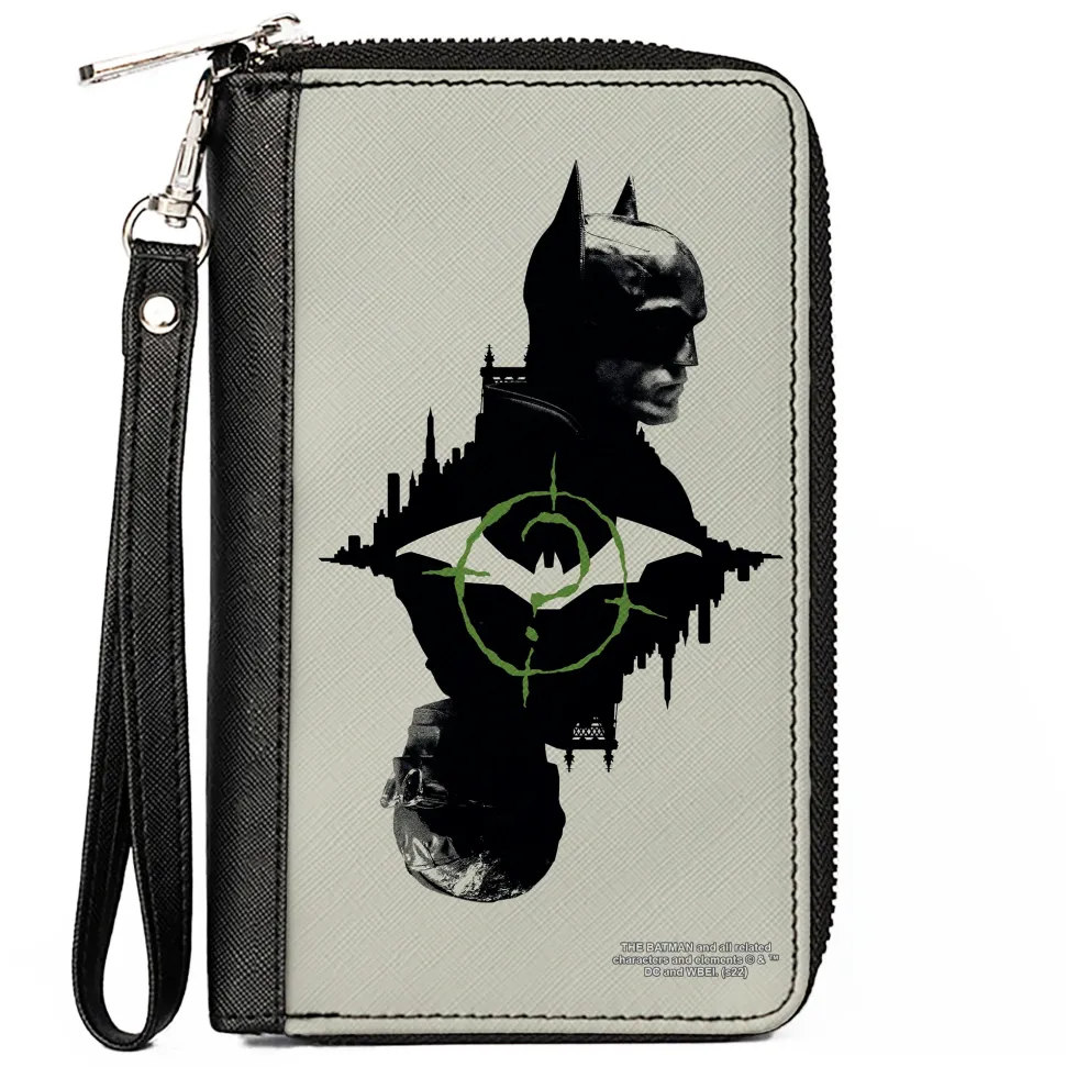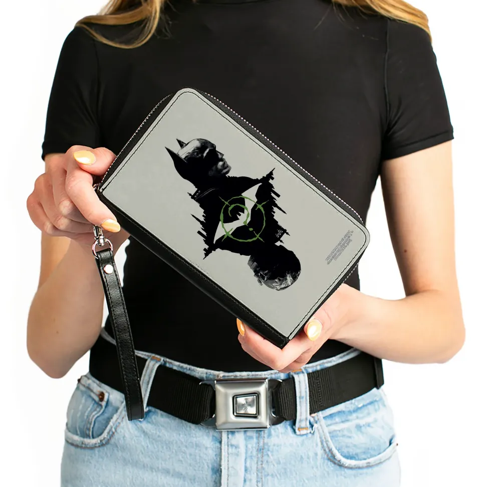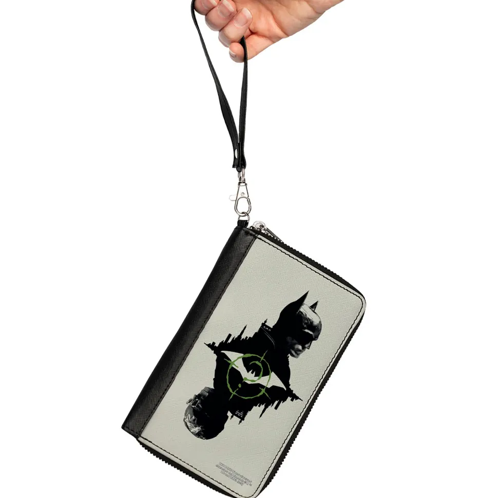 PU Zip Around Wallet Rectangle – The Batman Movie Batman and Riddler Poses and Logos Cityscape Grays Black Green