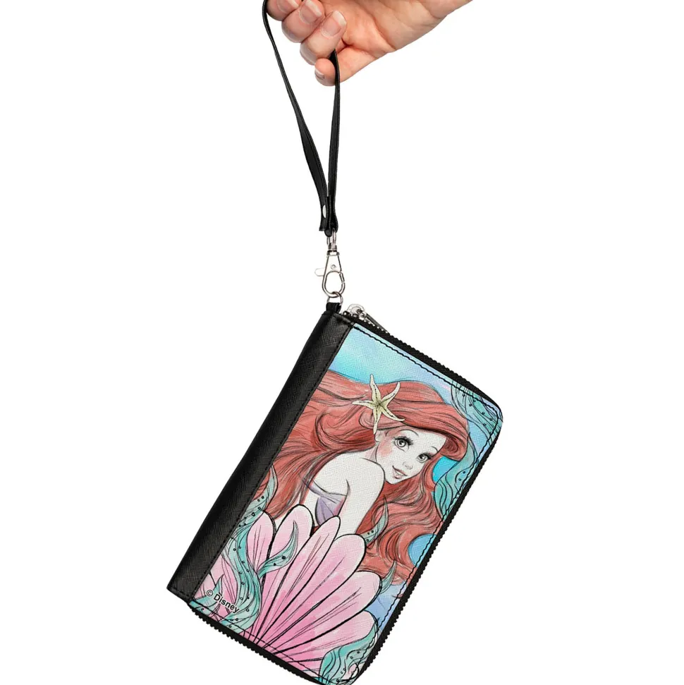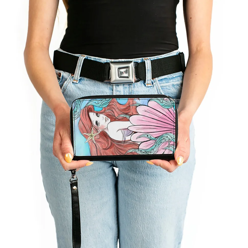 PU Zip Around Wallet Rectangle – The Little Mermaid Ariel Over Shoulder Sketch Pose Blues/Pinks