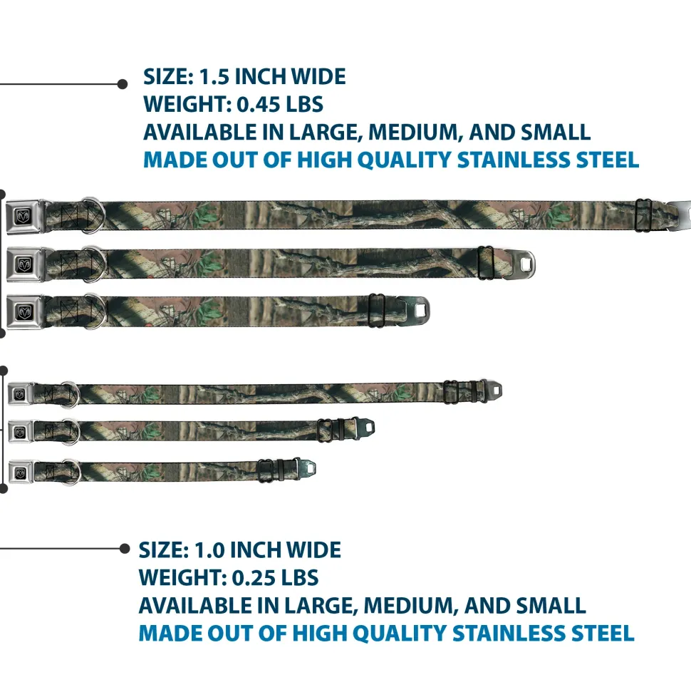 Your dog will be the talk of the town when people notice they’re wearing this awesome SeatBelt Dog Collar! Made from high-density polyester and durable steel components, this collar is built to last. It features beautiful vibrant artwork. The buckle is a miniature authentic SeatBelt Buckle, so you press the center button to release the clasp. This product is Made in USA by Buckle-Down Inc. and officially licensed by Mossy Oak.