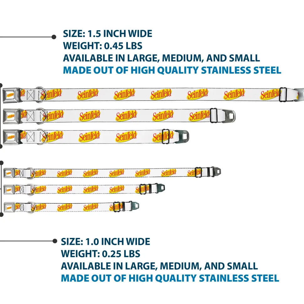 Your dog will be the talk of the town when people notice they’re wearing this awesome SeatBelt Dog Collar! Made from high-density polyester and durable steel components, this collar is built to last. It features beautiful vibrant artwork. The buckle is a miniature authentic SeatBelt Buckle, so you press the center button to release the clasp. This product is Made in USA by Buckle-Down Inc. and officially licensed by Seinfeld.