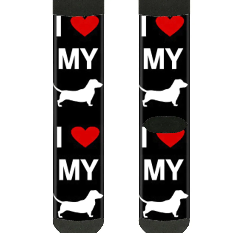 Sock Pair - Polyester - I "HEART" MY "WIENER" Dog Silhouette Black White Red - CREW