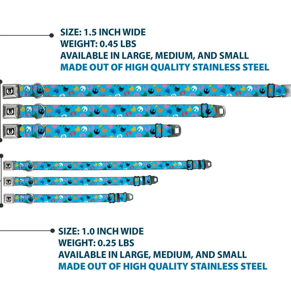 Your dog will be the talk of the town when people notice they’re wearing this awesome SeatBelt Dog Collar! Made from high-density polyester and durable steel components, this collar is built to last. It features beautiful vibrant artwork. The buckle is a miniature authentic SeatBelt Buckle, so you press the center button to release the clasp. This product is Made in USA by Buckle-Down Inc. and officially licensed by Lucasfilm Ltd.