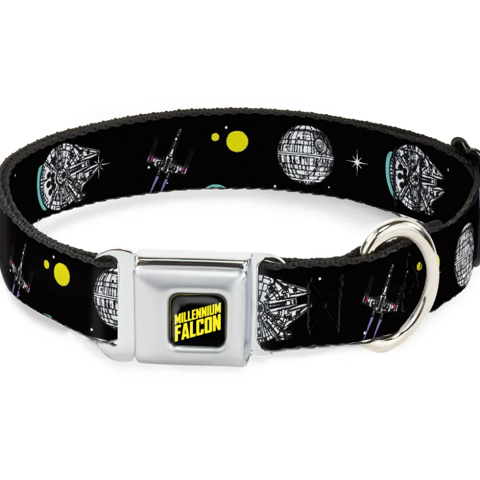 Star Wars MILLINNIUM FALCON Text Full Color Black/Yellow Seatbelt Buckle Collar – Star Wars Death Star Millennium Falcon and X-Wing Fighter in Space Black