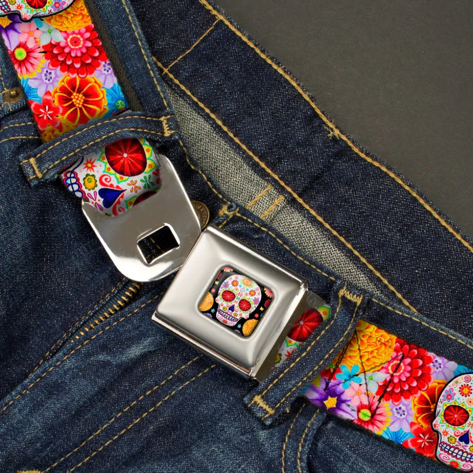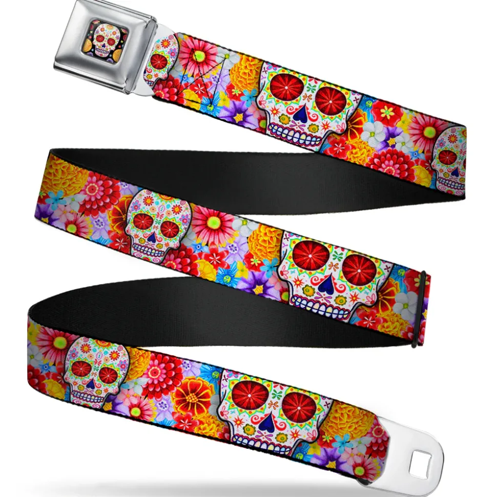 Sugar Skull Starburst Full Color Black/Multi Color Seatbelt Belt – Sugar Skull Starburst White/Multi Color Webbing